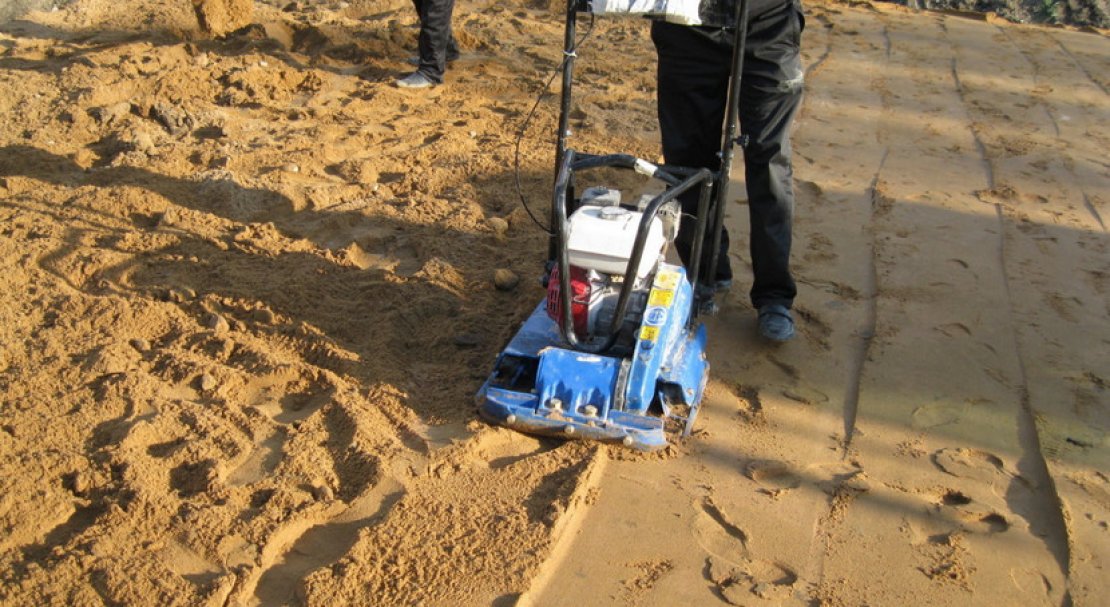 - Верхній шар піску на ділянці необхідно зняти на товщину до 40 см. Не поспішайте від нього позбуватися — його висипають купою неподалік, так як пісок знадобиться для створення наступних шарів.