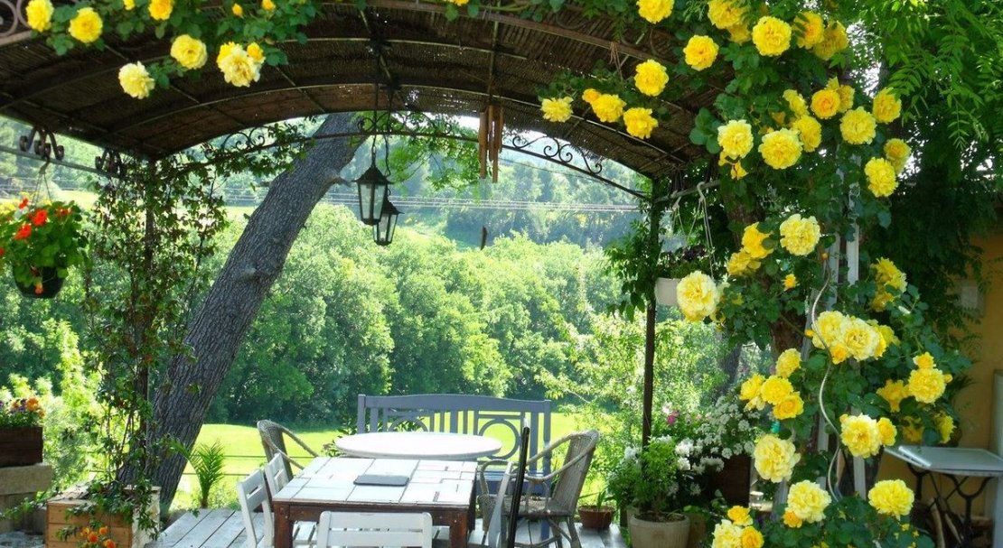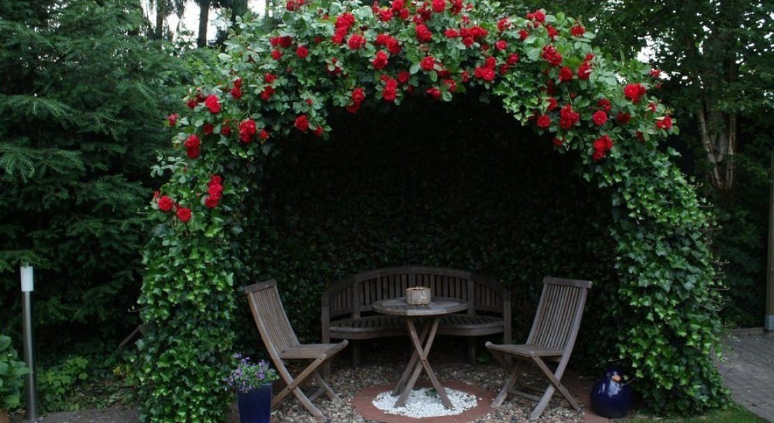 Місце для романтичних вечорів і хорошого відпочинку може створити пергола, на якій будуть рости квітучі та ароматні культури: плетиста троянда, хміль, в'юнок жимолости, декоративна гарбуз і чубушник. Така опора буде не лише красивою, а й довговічною. Проте для цього доведеться відкласти кошти.