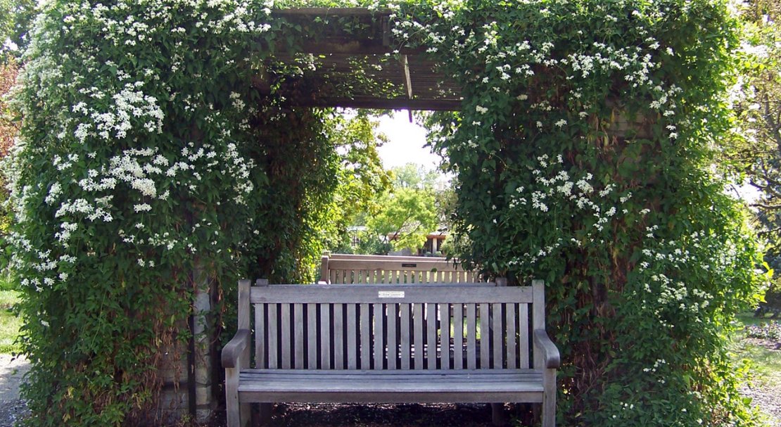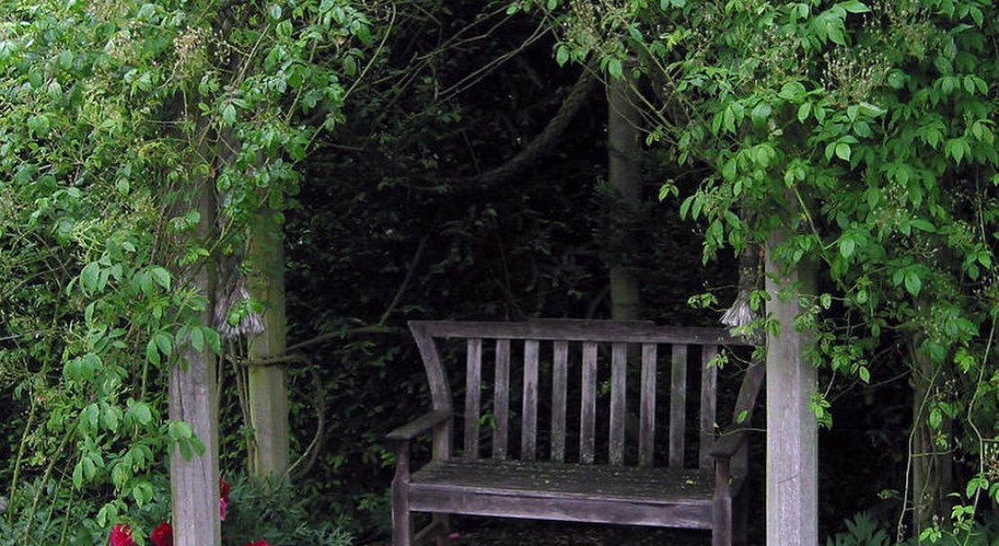 Якщо ви хочете створити над лавкою затінений навіс, то можна скористатися арочною конструкцією з дахом і бічними стінами з прутів, по яких пустити повиватися підходящі для цього рослини.