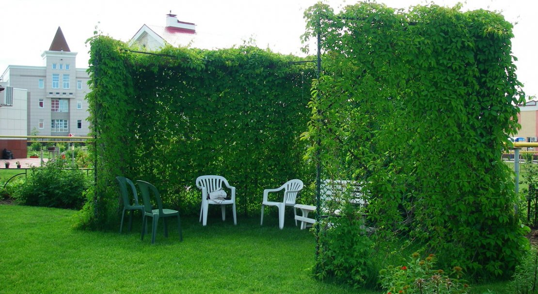 Для того, щоб розділити територію саду на умовні ділянки, можна використовувати різні опори, ширми, по яких будуть повиватися зелені улюбленці. Решітки можна виготовити з дерев'яних рейок або металевих прутів. Підійдуть для огородження певної ділянки та перголи — решітчасті бесідки без даху, які також прикрашають ползучою зеленню. Така споруда чудово зберігає прохолоду в спеку та захищає від вітру.