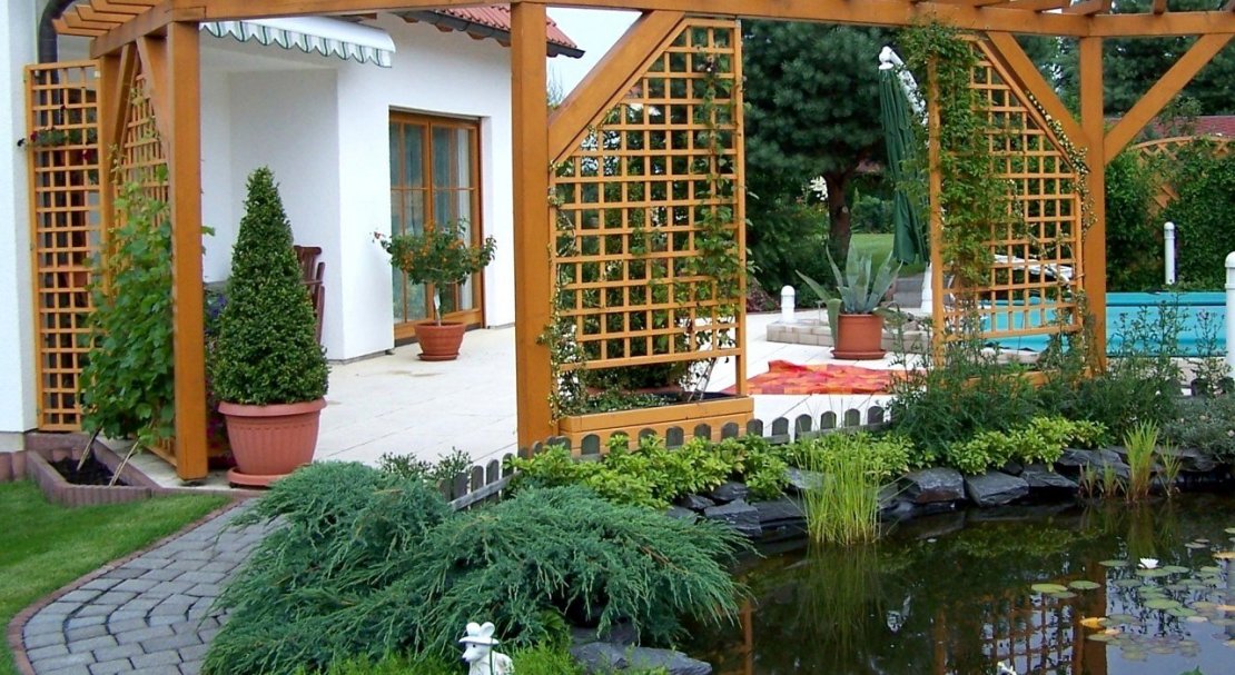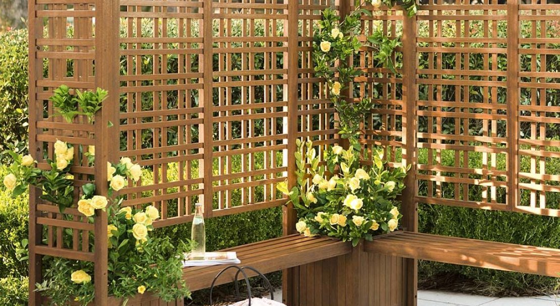 Конструкції для рослин можуть бути у вигляді дерев'яних решіток з сосни, лиственниці, дуба. У такому випадку стебла садових витончених культур проникають через решітку.