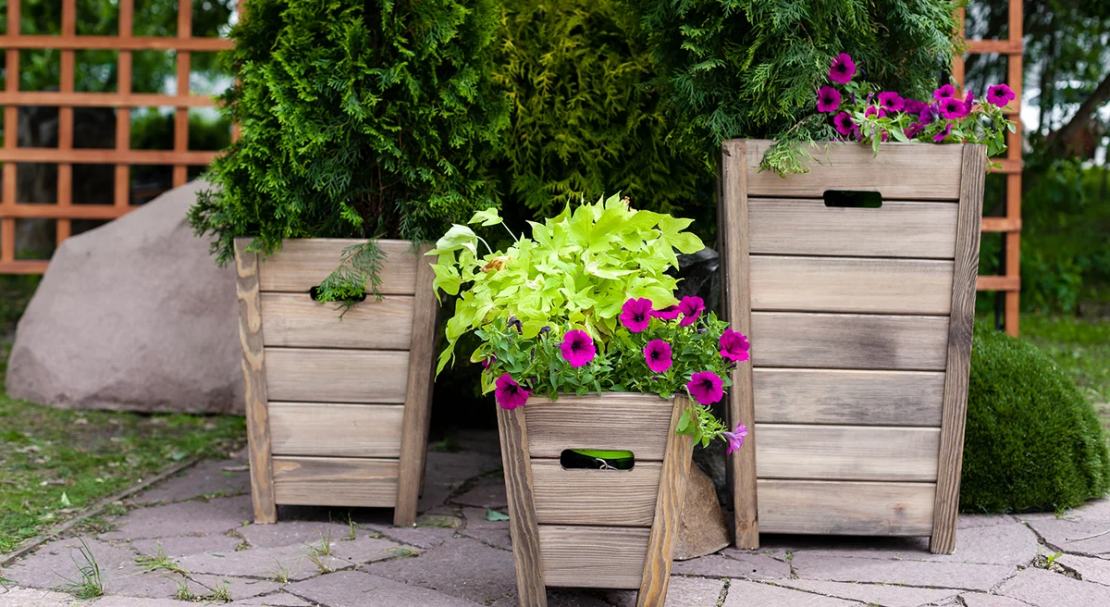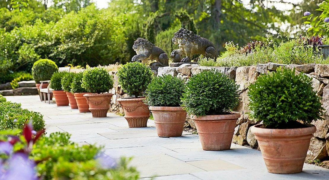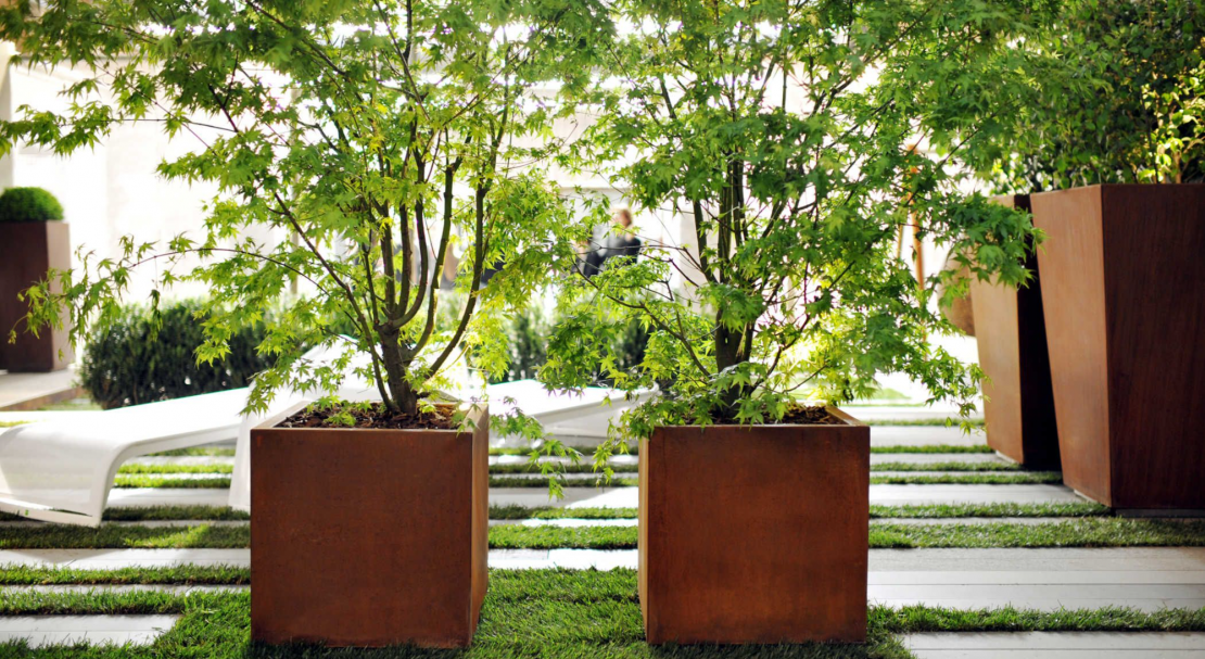 Стійки з такими контейнерами гарно виглядають вздовж садових доріжок, при під'їзді до будинку. Такий ефект можна досягти також за допомогою карликових дерев, крону яких формують у визначену форму.