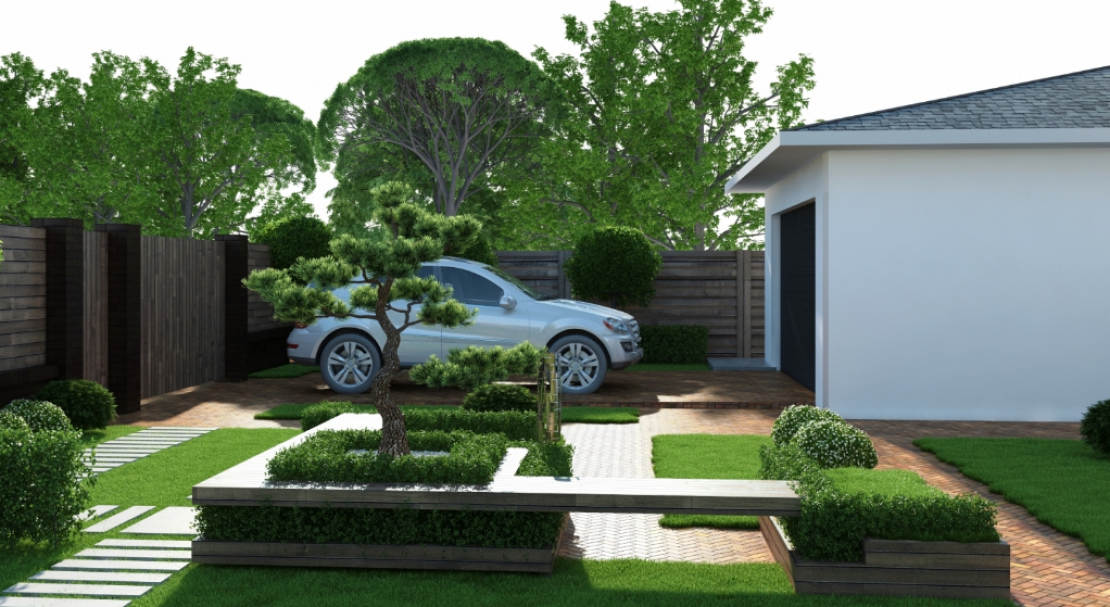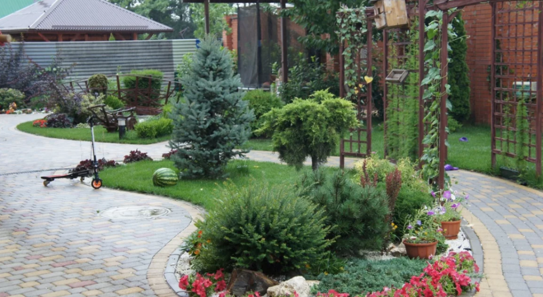 - Передня частина ділянки буде місцем, де грають діти або ростуть рослини. Ця ділянка також може бути нейтральною з посадженими біля входу хвойними або невеликими клумбами.