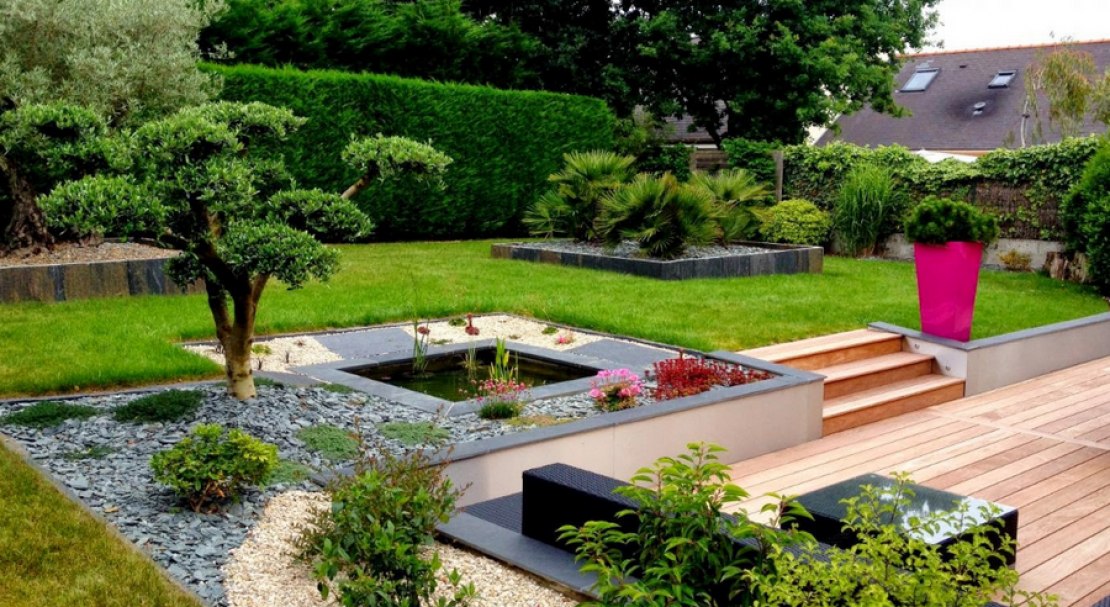 Ділянка правильної квадратної форми відноситься до найпростіших у виконанні. Її легко можна розділити на 4 зони (відпочинку, обідню, садову, ігрову). Будинок на ділянці розміщують ближче до входу, разом із ігровою зоною, а зону відпочинку та сад організовують у задній частині подвір'я.