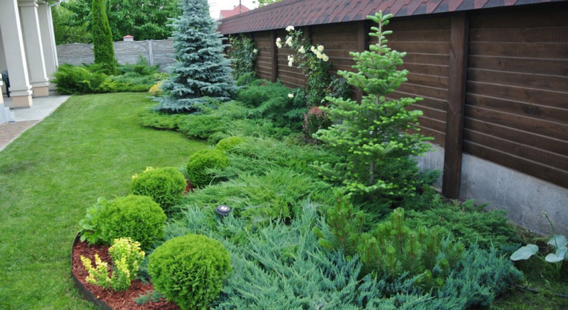 - Недуже великі хвойні, такі як тис, можжевельник, кипарис або туя підходять для невеликої території, оскільки зростають низькорослими, не затіняють інші насадження, а зайвий обсяг крони можна видалити за допомогою ножиць.