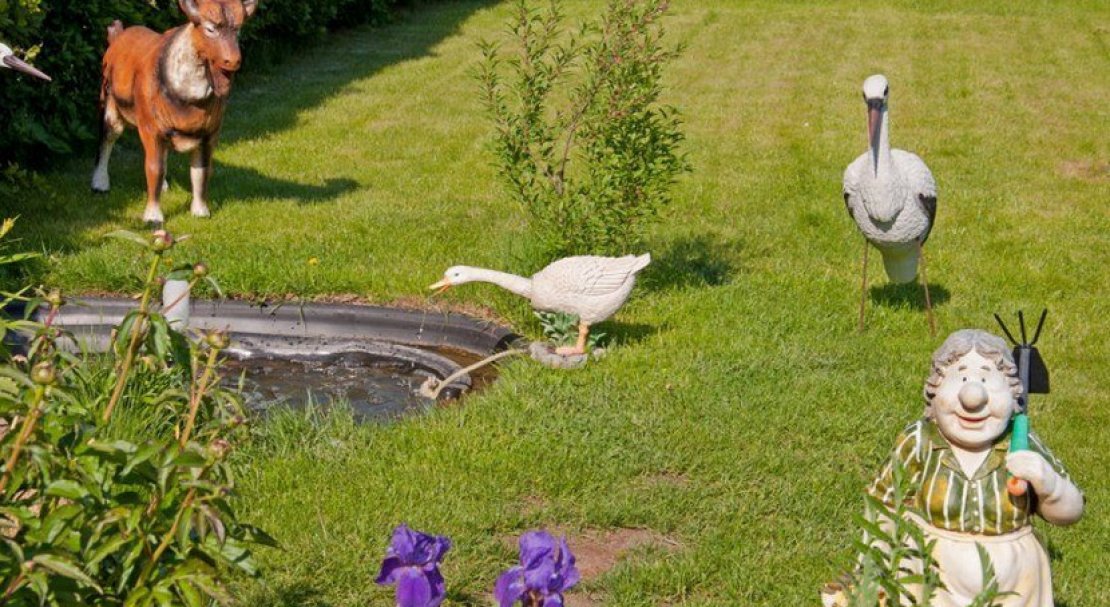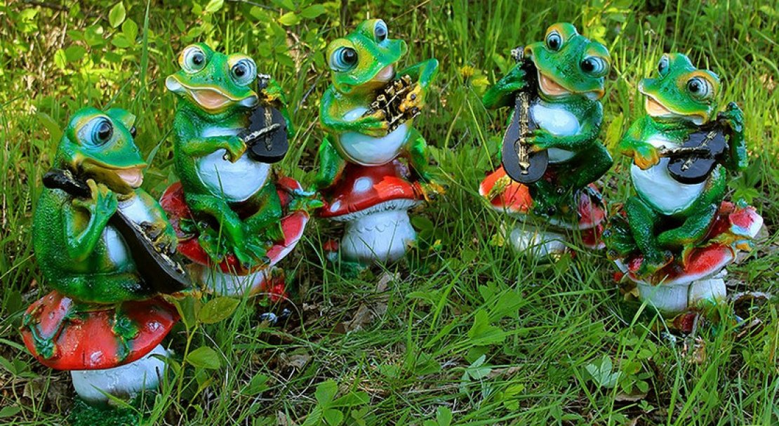 - Ландшафтний або сільський стиль. Ідеально підходять казкові герої для створення чарівних лукашів. Їх встановлюють в квітники, на газони, поруч із кущами. Завжди радіють малим дітям та любителям фантастики. Тварин та рослини розставляють згідно з середовищем їх перебування. Жаби, черепахи, чаплі прикрашають водойми. Котики, вулики, гриби розміщують на городах, поруч з лавками та вздовж садових стежок.