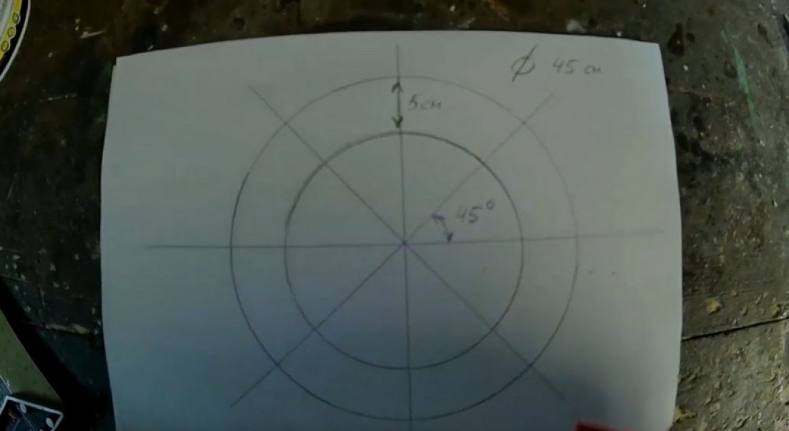 - За допомогою планки і вставленого всередину грифеля навколо чітко описують круг. Аналогічним способом, але з меншим розміром дошки, створюють внутрішнє коло. Ці два круги будуть ободом. Слід пам'ятати, що всі розміри мають відповідати параметрам, вказаним в малюнку.