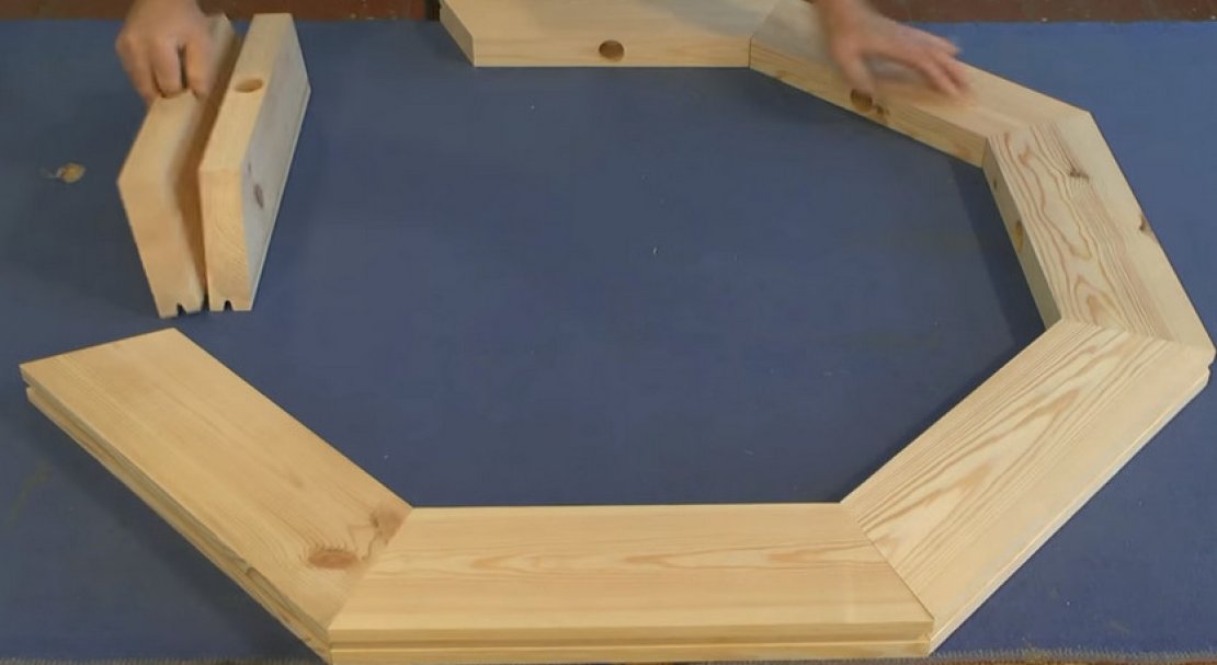 - Отриманий круг знову ділять на 8 рівних секторів. Відповідно на ободі також повинно бути стільки ж відміток. Виходячи з розміру, вирізають з дерева невеликі бруски. Їх довжина і ширина будуть залежати від вказаних параметрів при вимірюванні. Кінці рівняють аккуратно так, щоб вийшов вигляд восьмикутника. Обов'язково переконатися в тому, що місце з'єднання ідеально збігається з пазом усередині обода.