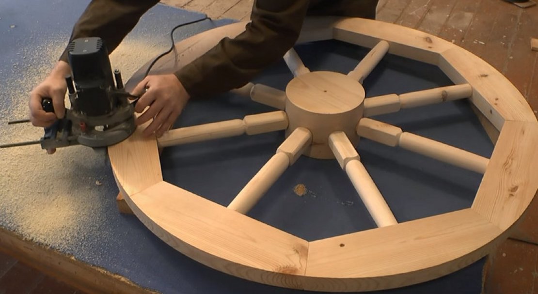 У центральній частині колеса необхідно розмістити дерев'яну втулку, яка стане вузлом. Виготовити її можна зі спеціальної заготовки, наприклад, черенця від лопати, за допомогою електролобзика.