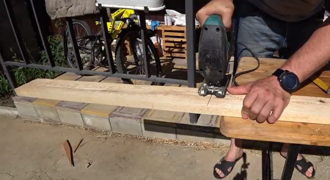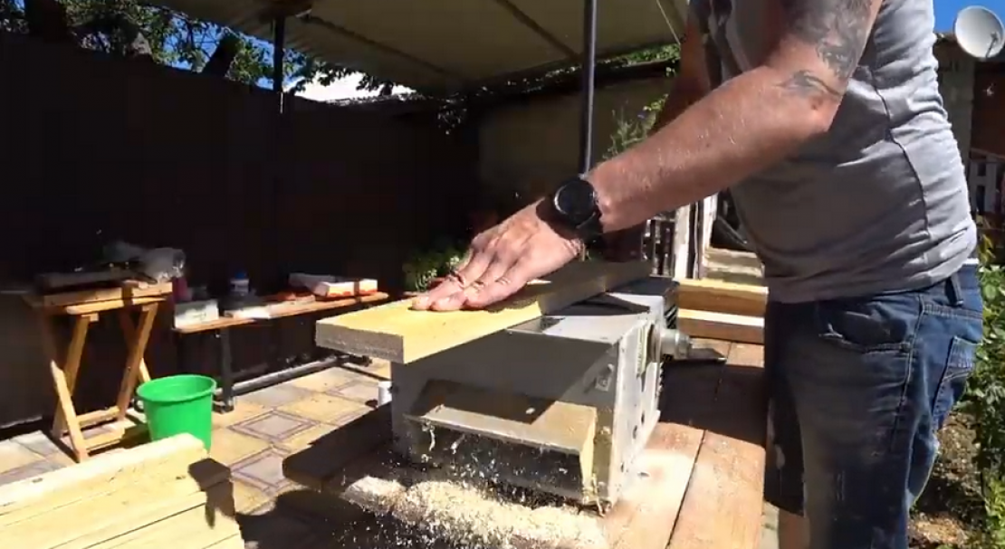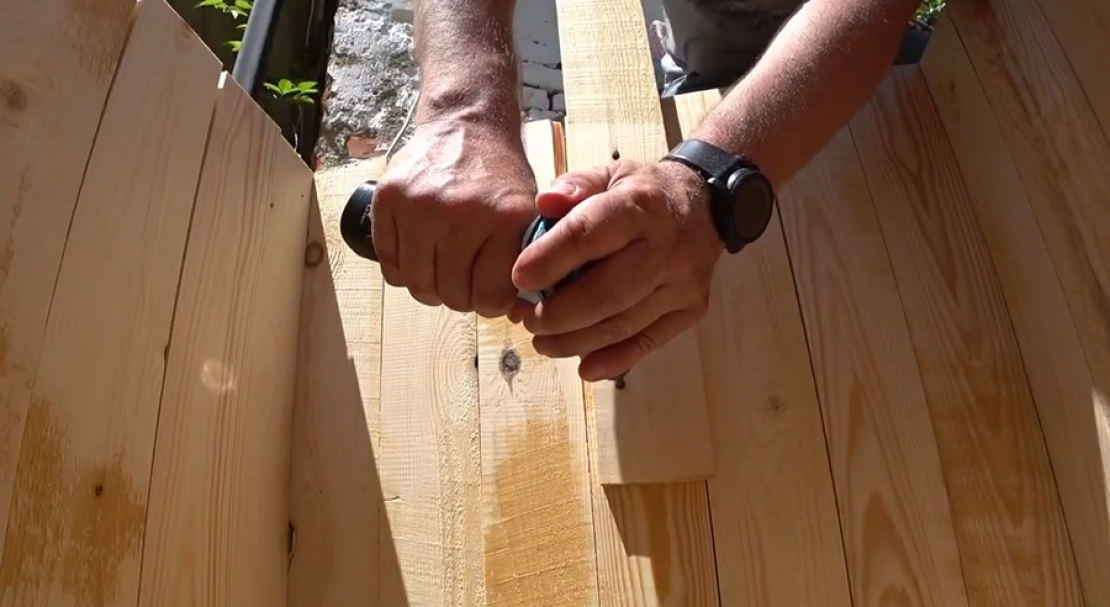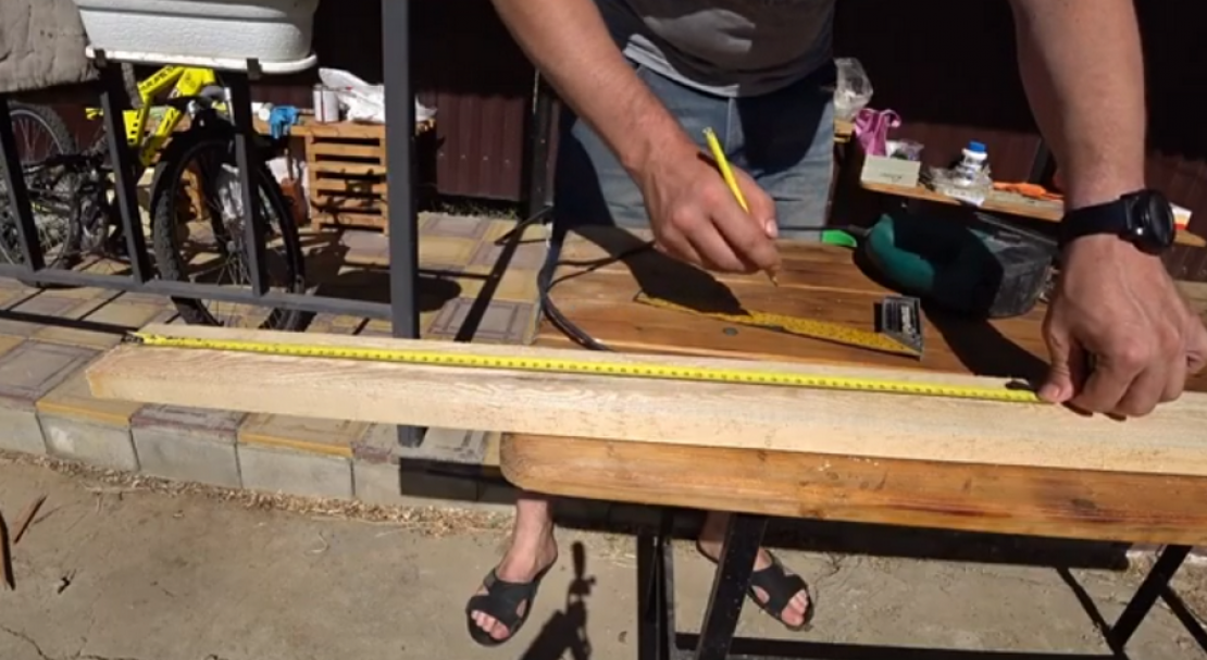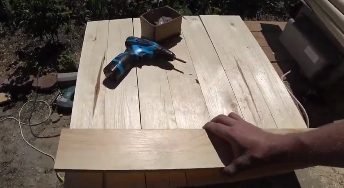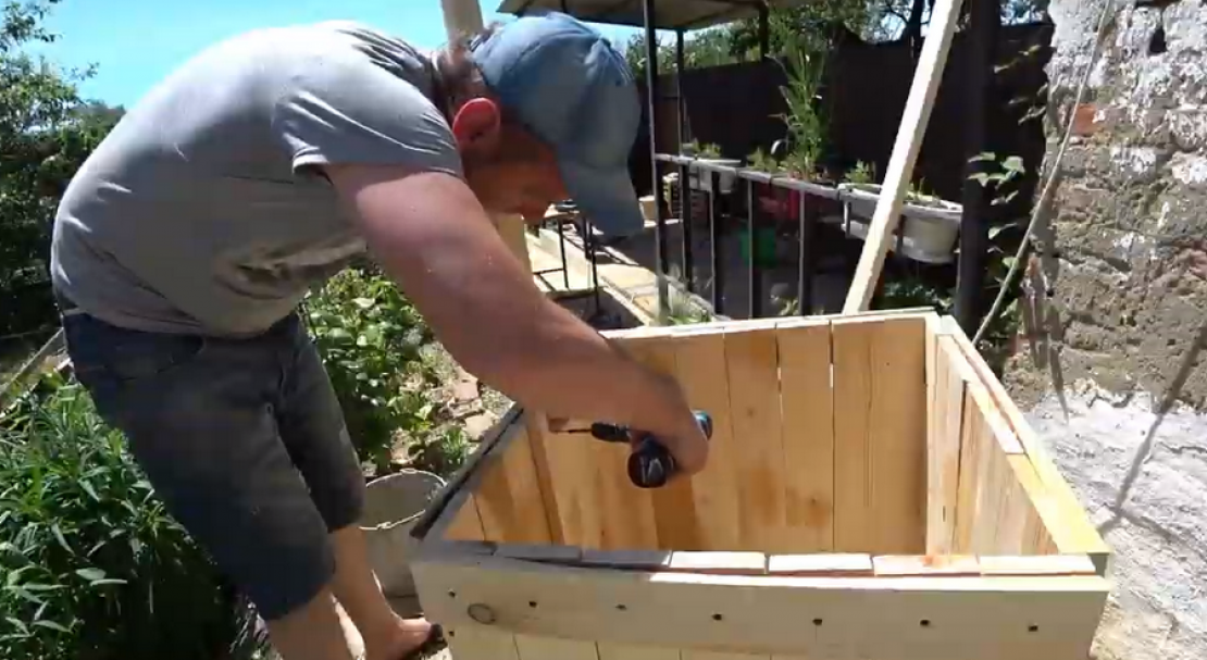- Дошку пиляють на 4 рівні частини для будівництва нижнього ящика майбутньої криниці. З'єднують між собою шурупами за допомогою шуруповерта таким чином, щоб дошки утворювали 4 прямі кути у вигляді квадрата або прямокутника, в залежності від дизайнерського рішення.
