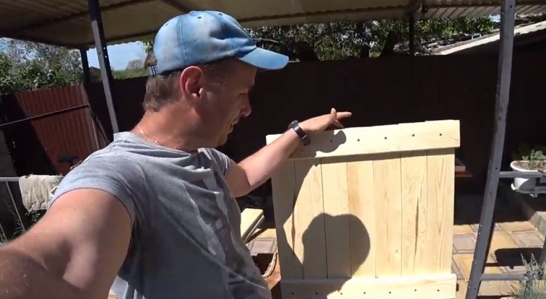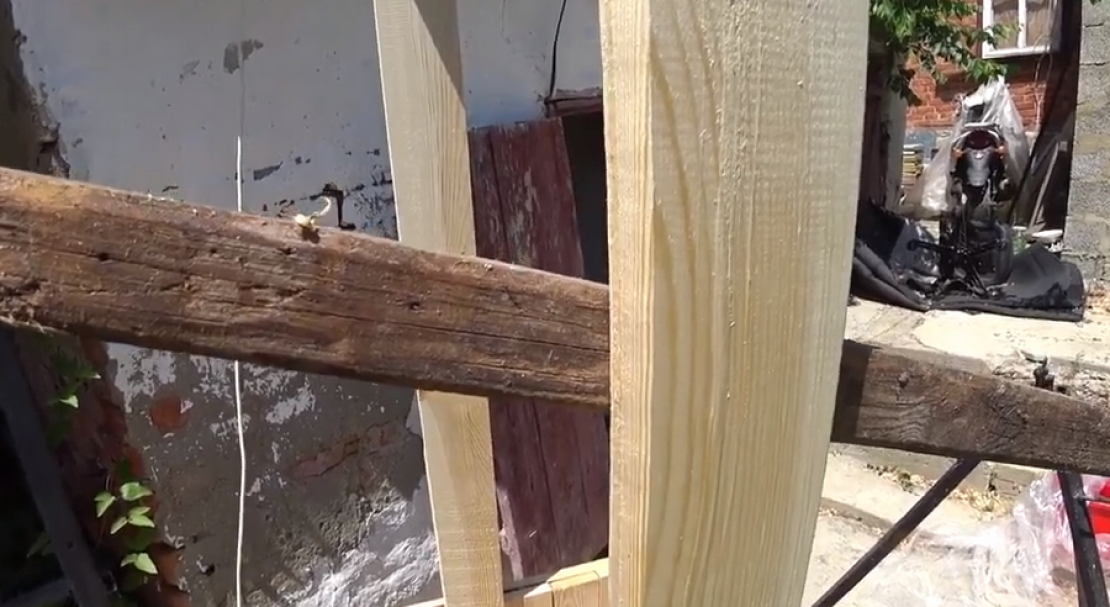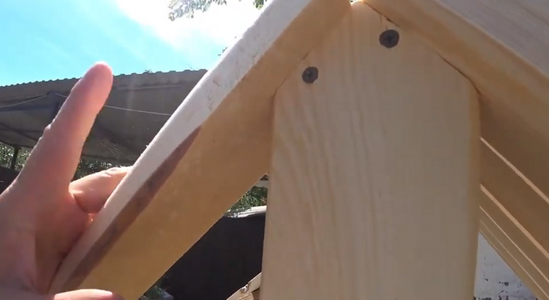 - Із 2 сторін ящика у внутрішній частині закріплюють дві однакові за розміром опори у вигляді довгих дощок, які будуть служити основою для майбутнього даху. Опори повинні мати рівні трикутні відрізи на кінцях, щоб дах був під нахилом і був симетричний.