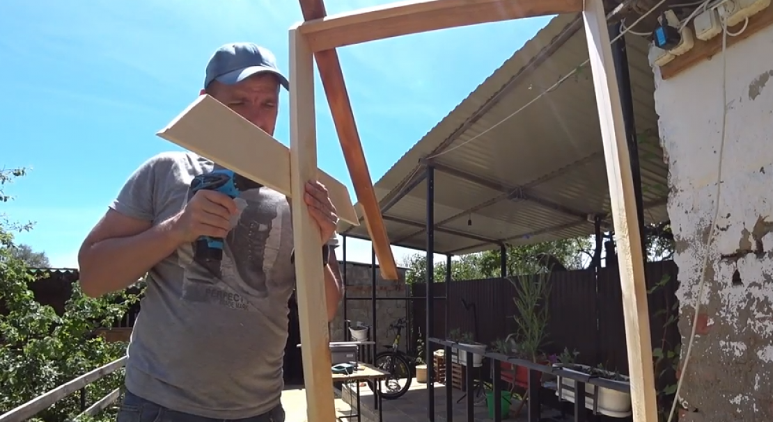 - Монтувати дах, приєднуючи 2 готові частини до опор за допомогою шуруповерта та саморізів.