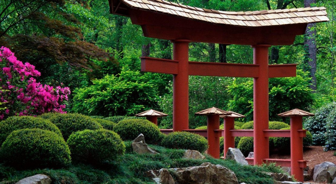 Кам'яні леви, бонсаі, ліхтарики