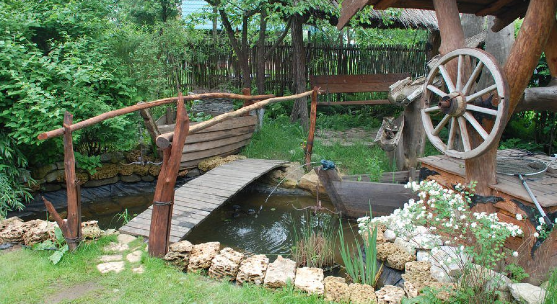 Найбільш підходить невеликий басейн, який нагадує заброшене озеро, його можна стилізувати за допомогою водяних кульбаб, ірисів, очерету, декоративних качок або лелек. Для досить широкого водоймища підійдуть плаваючі плоти, схожі на гнізда або квітники. Також поруч можуть знаходитися дерев'яні корита, наповнені водою. Можна побудувати біля озера невеликий фонтан.