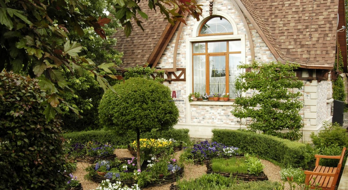 Починати зонування слід з будинку. Він повинен відповідати стилю. За допомогою сучасних будівельних матеріалів це можна зробити швидко та якісно. Важливо продумати форму ставнів та наличників.