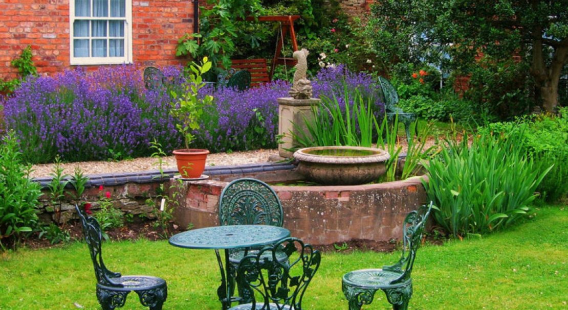 Старовинні статуї і скульптури світлих відтінків чудово підкреслять вишуканість композиції. Ще одним виграшним елементом може стати міні-фонтан або водойма. Приємний шум води лише додасить гармонії і домашнього затишку.