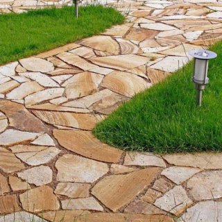 Такий благородний матеріал, як камінь, ідеально вписується в будь-який ландшафт. Його відзначають краса, довговічність і екологічність. Основними недоліками є висока ціна і складність при самостійній укладці через важку вагу. Крім того, при від'ємній температурі деякі породи можуть обледеніти і стати ковзкими. До дорогих сегменту відносяться базальт, граніт, мармур. Дешевше обійдуться пісковик, сланець, галька.
