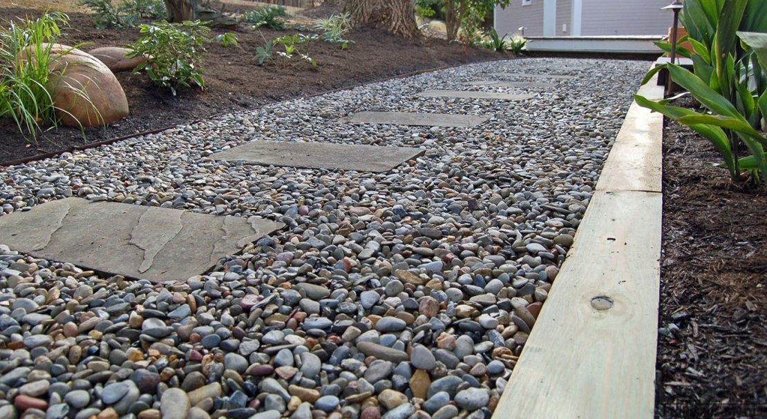 Гравій допоможе ділянці набути презентабельний зовнішній вигляд без серйозних витрат. Його також відрізняє простота використання — для реалізації якої-небудь ідеї не потрібно викликати цілу будівельну бригаду, достатньо засипати обрану область та ущільнити її. Щоб гравій не розсипався по ділянці, слід обов'язково створити бордюр. Головним мінусом такої доріжки є незручність при ходьбі.