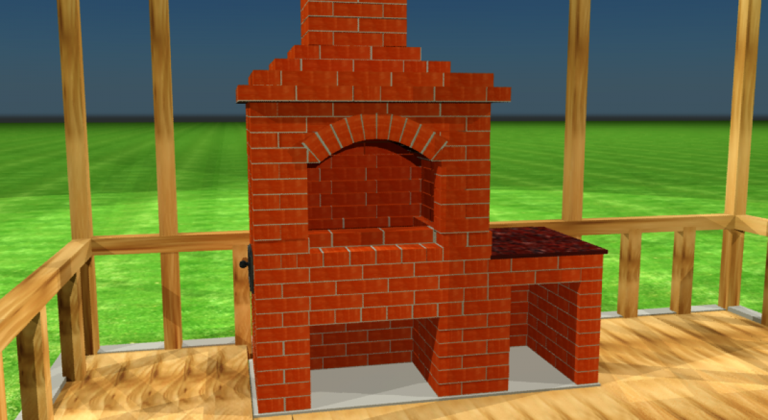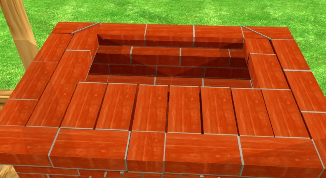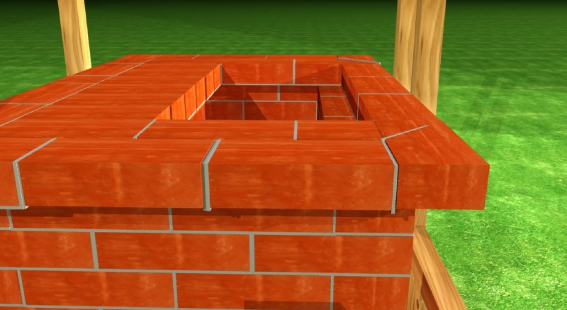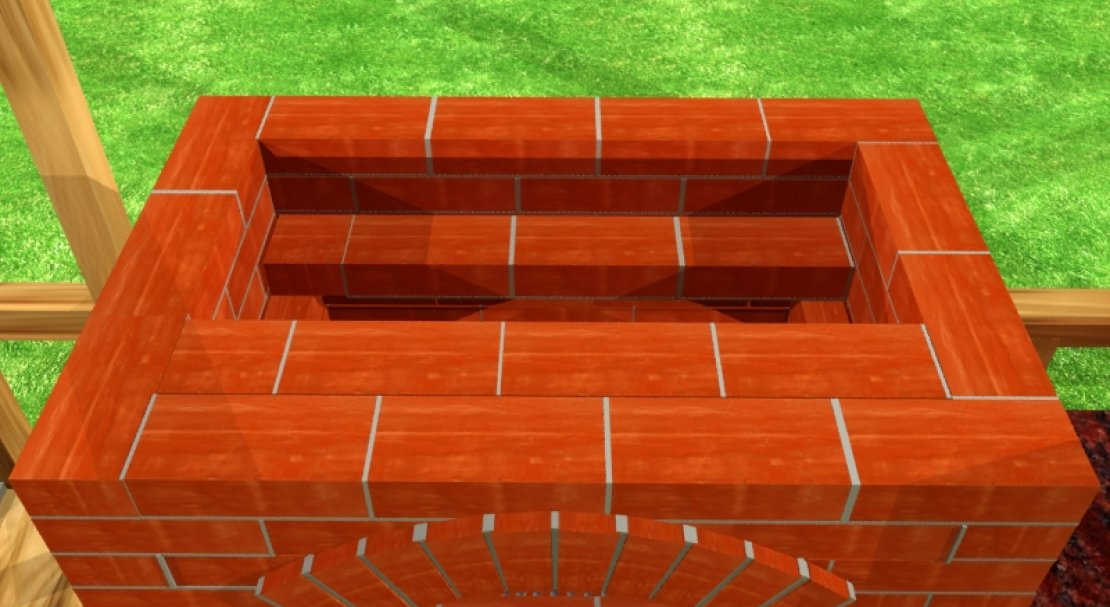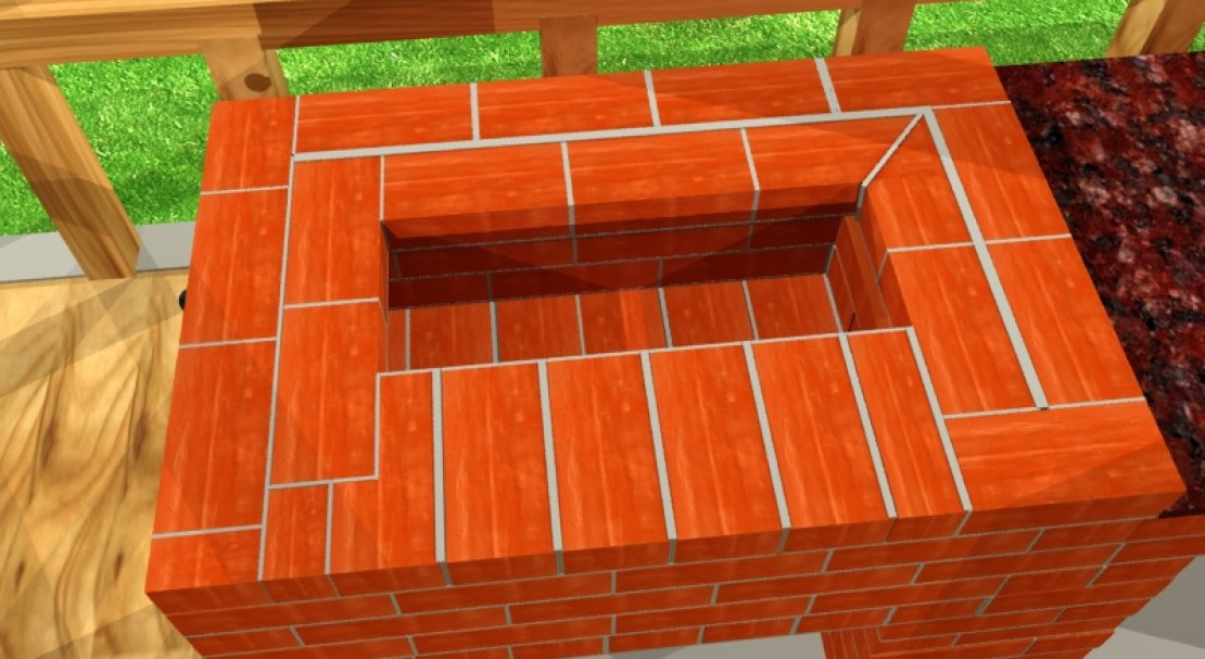Кладку задньої стінки роблять з трьох цеглин, бічних - з двох. Їх кладуть ложком на ложе. Дровник потрібно покласти висотою 10-11 цеглин. Поличку під піч роблять методом в цеглину. На неї встановлюють сталевий лист. Наступний ряд кладеться також методом в цеглин по всьому периметру прямокутника. Цегляні стінки слід кладти аккуратно, вимірюючи рівне положення кладки будівельним рівнем.