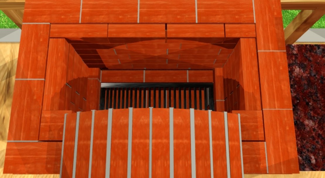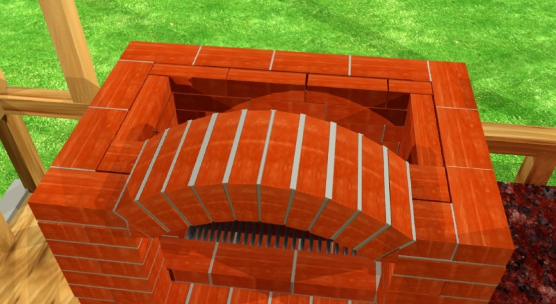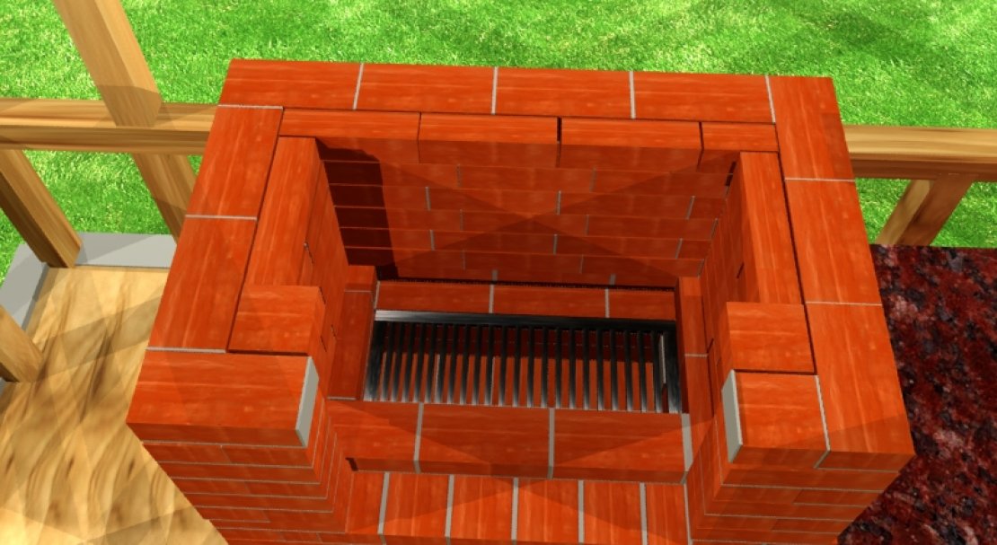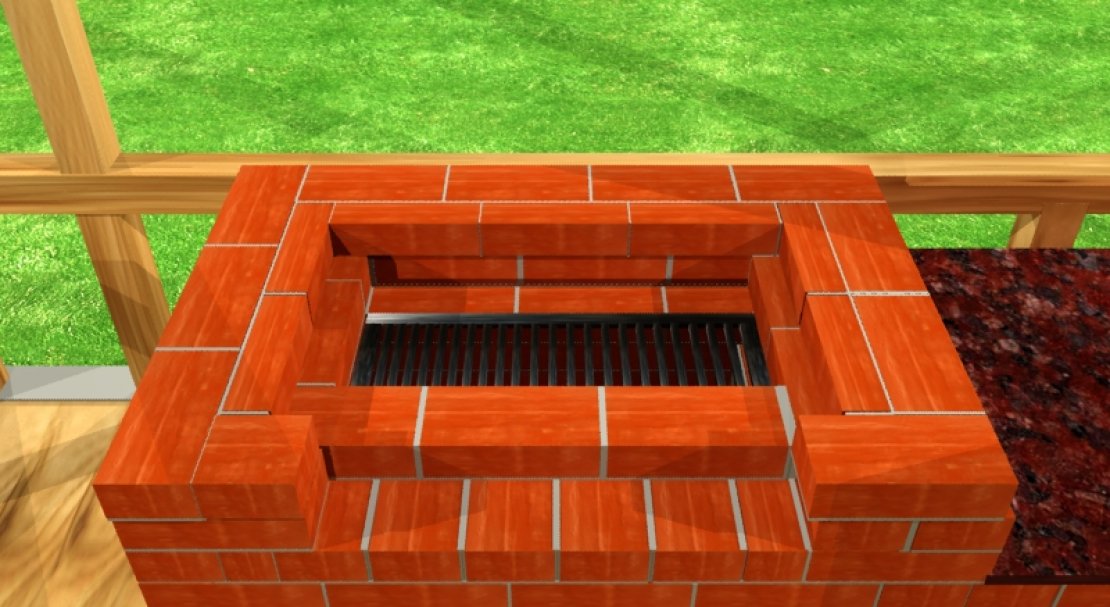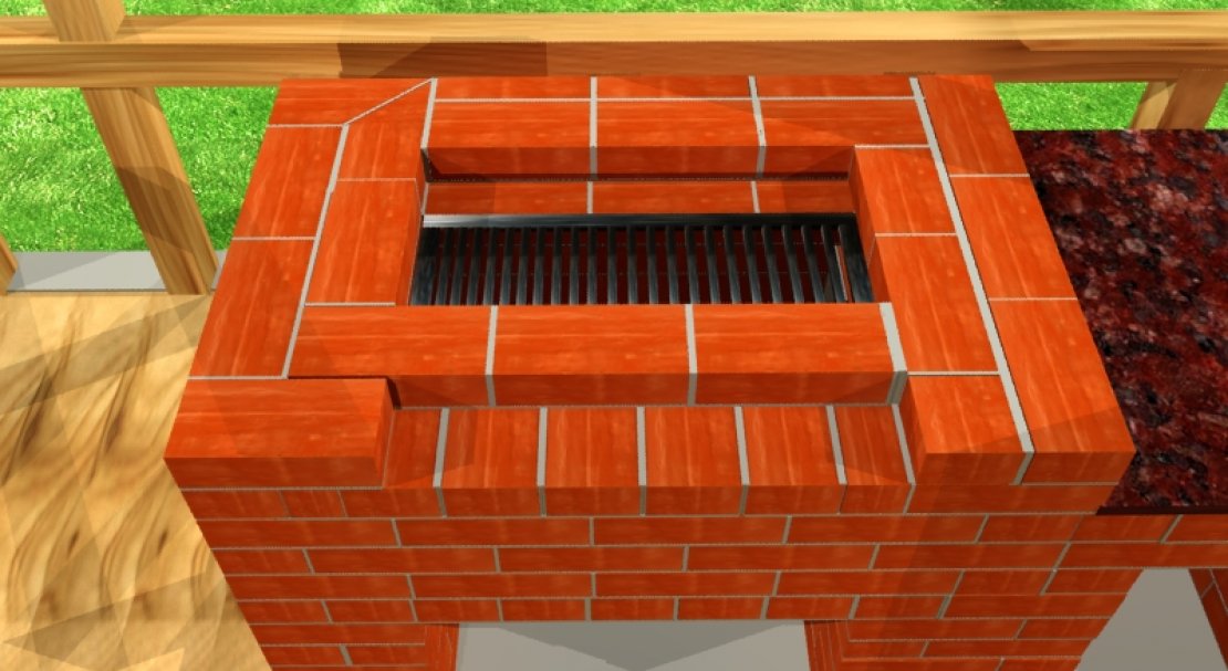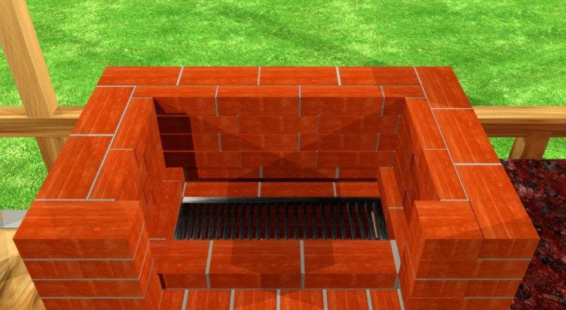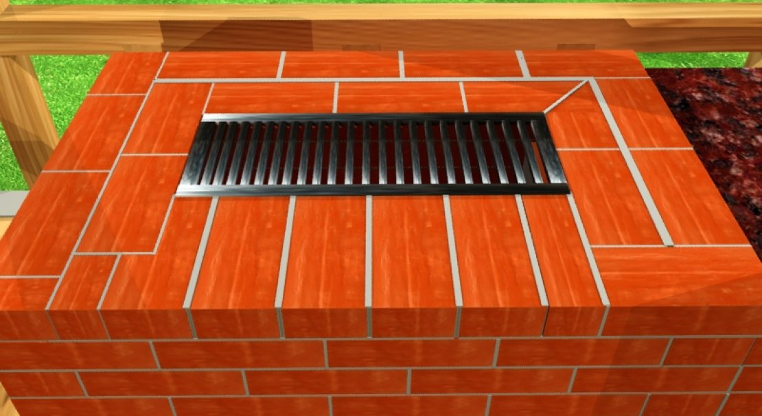 Після завершення формування очагу і відсіка під посуд слід приступити до кладки жарильного простору. З передньої частини необхідно вкласти захист з одного ряду блоків. Кладка виконується строго за схемою. У цій частині треба слідкувати за правильністю розміщення цегли і не забувати переплітати шари блоків. Сітку для барбекю можна придбати готовою або зробити самостійно зі сталевих прутів. Оптимальна висота жаровни - 5 рядів.