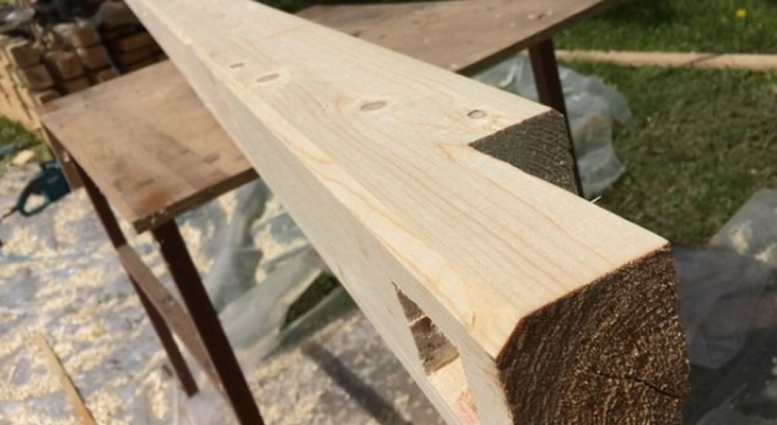 - Всі стійки кріпляться за допомогою кутників і саморізів. Після цього роблять верхню обв'язку, аналогічно нижній, тільки вона буде чотирикутної форми. На половині висоти між стійками роблять розпорки з того ж бруса, закріпленого на кутники та саморізи.