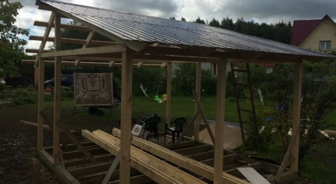 - Далі воздівляють дах, він може бути двосхилим або чотирьохсхилим, і роблять покриття. Дах краще робити внизу, на землі, самою простою стропильною конструкцією. Його обшивають дошками і профнастилом або ондуліном. У обшивці даху слід залишити отвір під димохід. Потрібно розрахувати розташування таким чином, щоб він розташовувався над центром мангала.