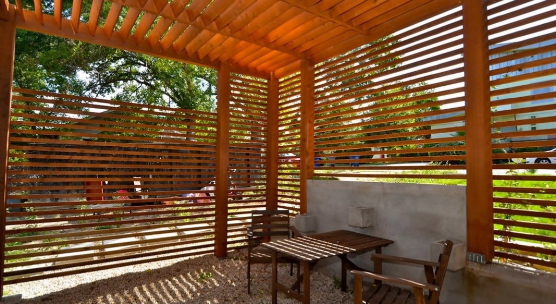- Дерево. Матеріал, придатний як для зовнішньої, так і для внутрішньої обробки. Можуть використовуватися обрізні дошки, вагонка, блок-хаус, решітка з рейкою. Найбільш доступним варіантом є обрізна дошка. У бесідках з метою декору частіше використовується дерев'яна решітка з рейок. Її прикрашають підвісними рослинами. Сучасним матеріалом є блок-хаус. Це циліндрична вагонка, що створює ефект бруса.