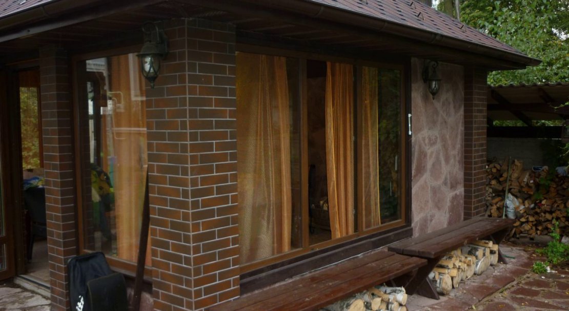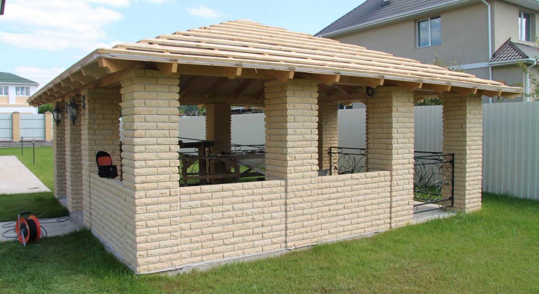 - Цегла, камінь, плитка. Матеріали, що використовуються при декоруванні мурованих стовпів, парапета, підлоги, зон з підвищеною пожежною безпекою: барбекю, каміну, мангалу. Цей декор довговічний, багатофункціональний і надає бесідці презентабельний вигляд.