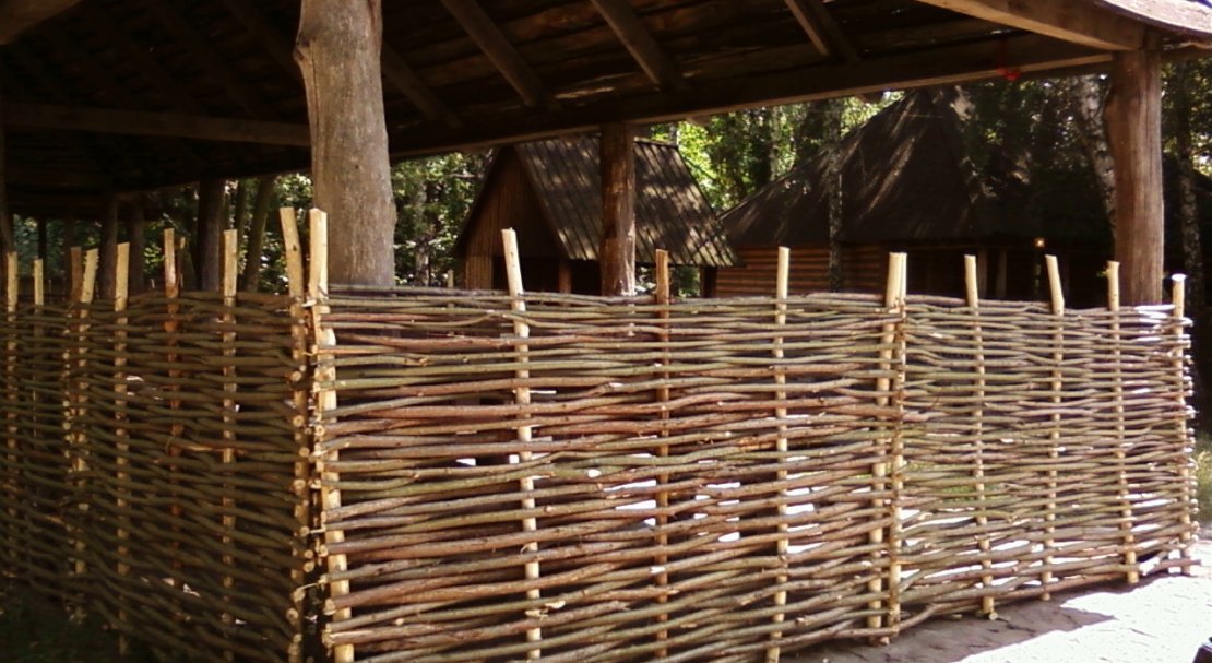 - між опорними стовпами на відстані приблизно 50 см встановлюють тонші прутики, навколо яких виконується плетіння;