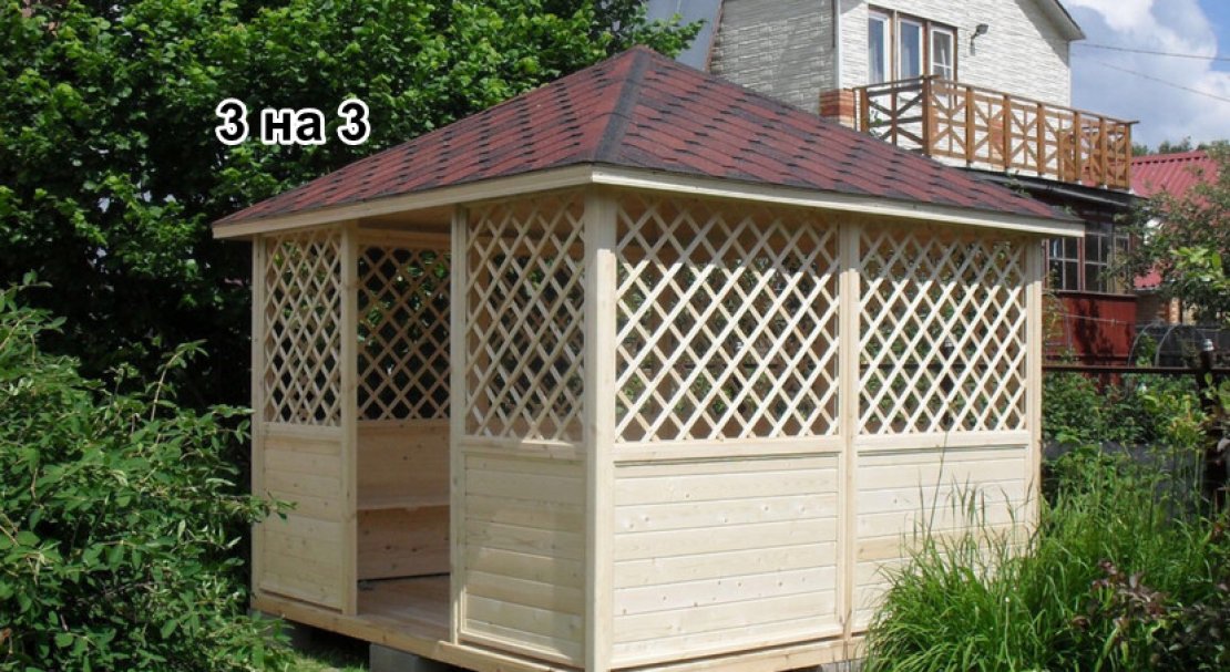 - 3×3 м. Компактна квадратна альтанка розрахована на комфортне перебування 6 осіб (максимум — 10);