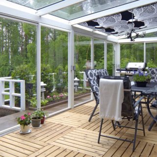 - Часткове — передбачена виключно для літніх веранд і виконує роль захисту від неблагоприятних погодних умов (вітру, дощу).![Часткове остеклення Часткове остеклення]()