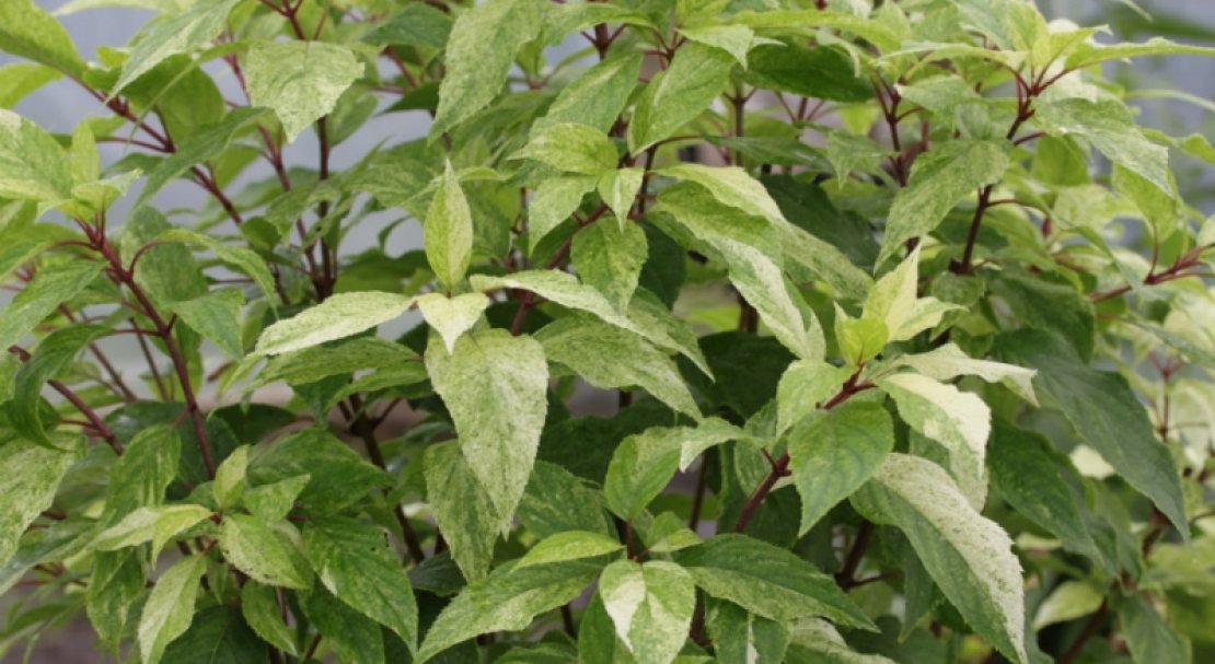 - листья: имеют продолговатую форму, слегка зазубрены. Весной их цвет светло-зелёный, но постепенно темнеет, и на листовых пластинах появляются кремовые и жёлтые мазки. Отличается стабильной вариегатностью (пёстролистностью) окраски;