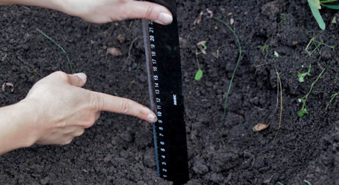 - Вертикально розмістити посадковий матеріал на глибину, рівну трьом висот цибулини.