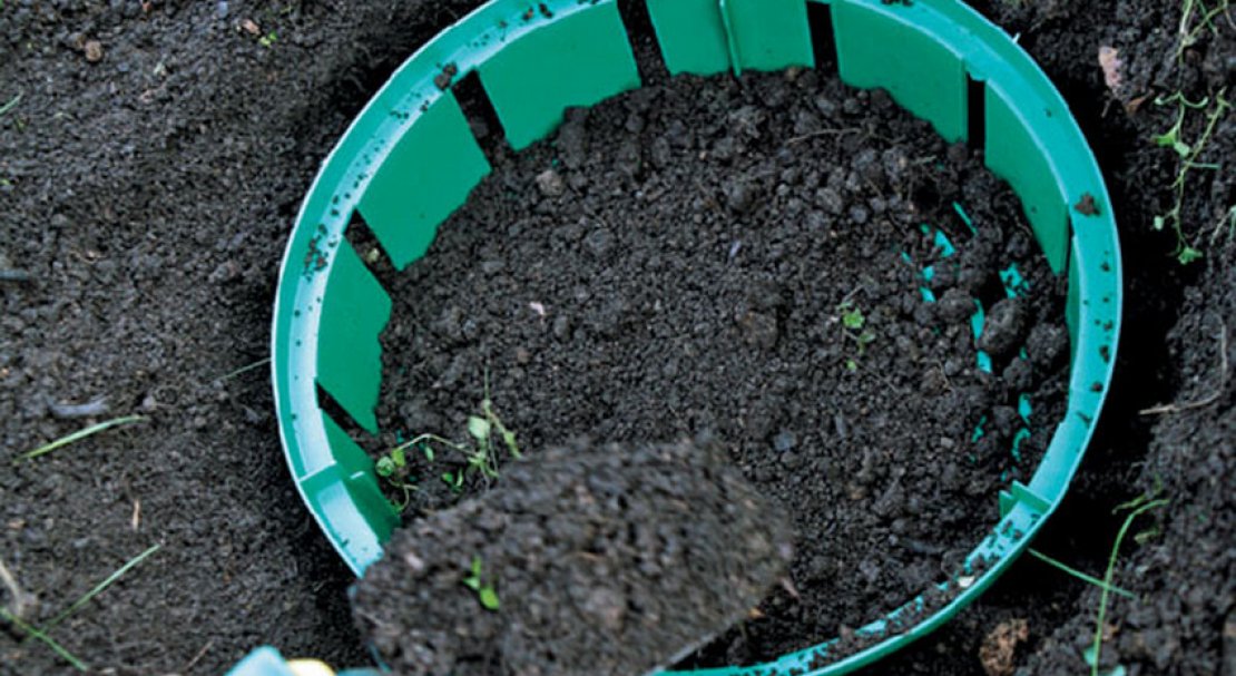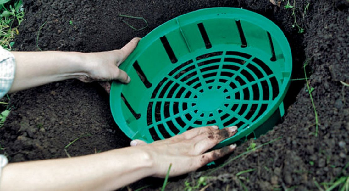 - Кошик помістити в викопане поглиблення потрібних розмірів і засипати землею.