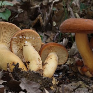 - Платівки під капелюшком — дуже рідкі, товсті і практично завжди добре зрощені з ніжкою. На початкових етапах розвитку гриба вони жовтуваті, але з плином часу стають брудно-жовтими і сіро-червонуватими при механічному пошкодженні тканин.
