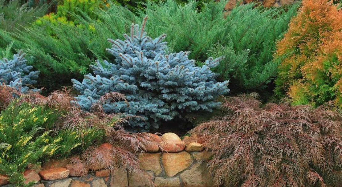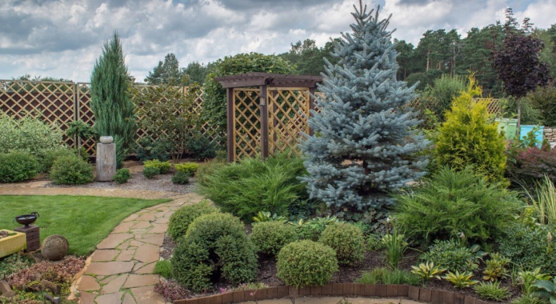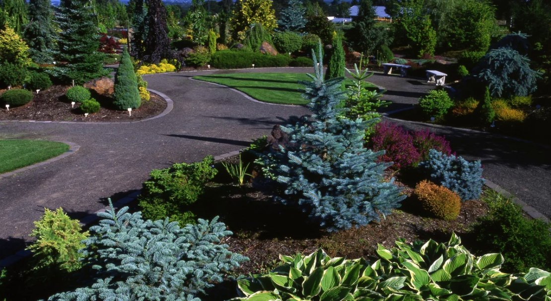 - Поєднання великих і маленьких ялинок при посадці стане візуальним екраном для розмітки меж або створення відокремленої зони в саду.