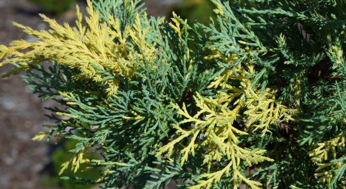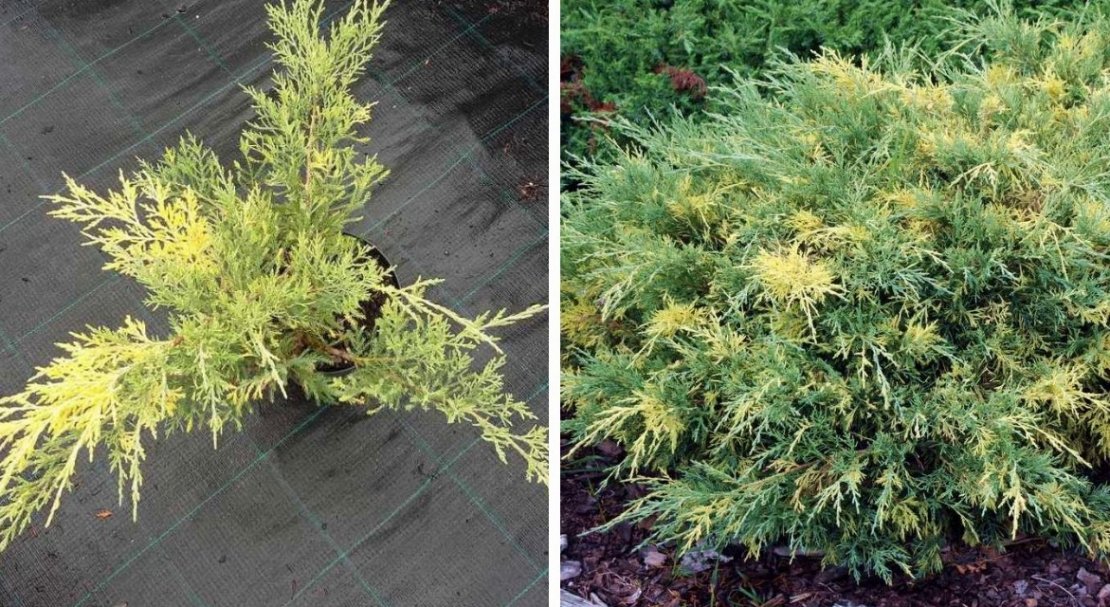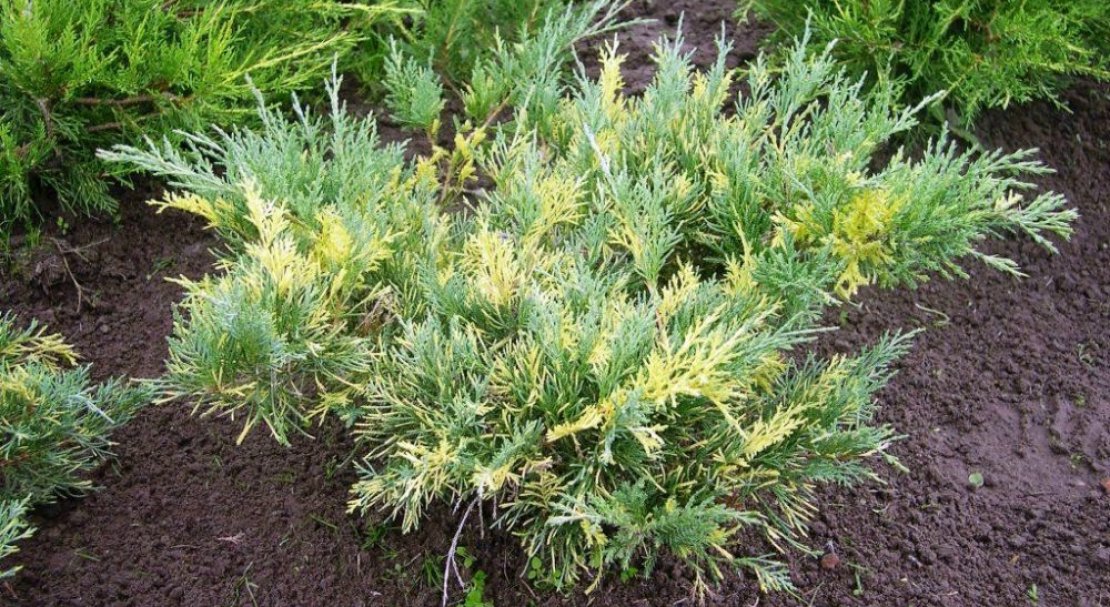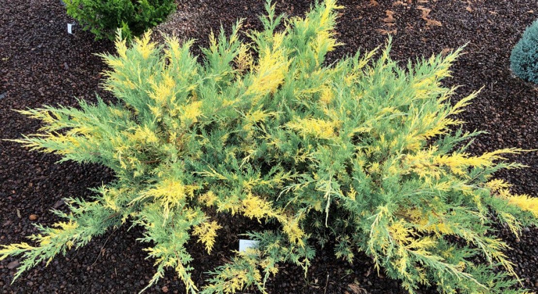 Juniperus media или же Juniperus pfitzeriana Blue and Gold очень популярен благодаря тому, что имеет двухцветную крону. На побегах этого кустарника растёт одновременно и голубая, и жёлтая хвоя, что выглядит очень оригинально. Его крона достаточно раскидистая, неправильной формы.