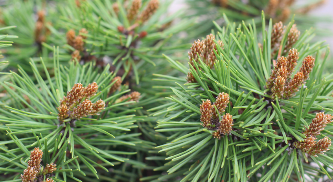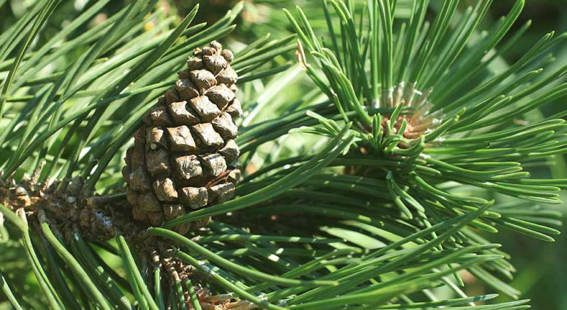- Изогнутые хвоинки растут на ветках пучками по 2-3 штуки. Они жёсткие, имеют насыщенный зелёный цвет с небольшим серым оттенком.