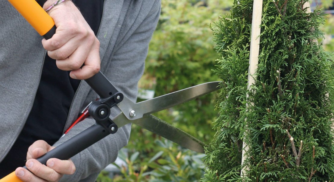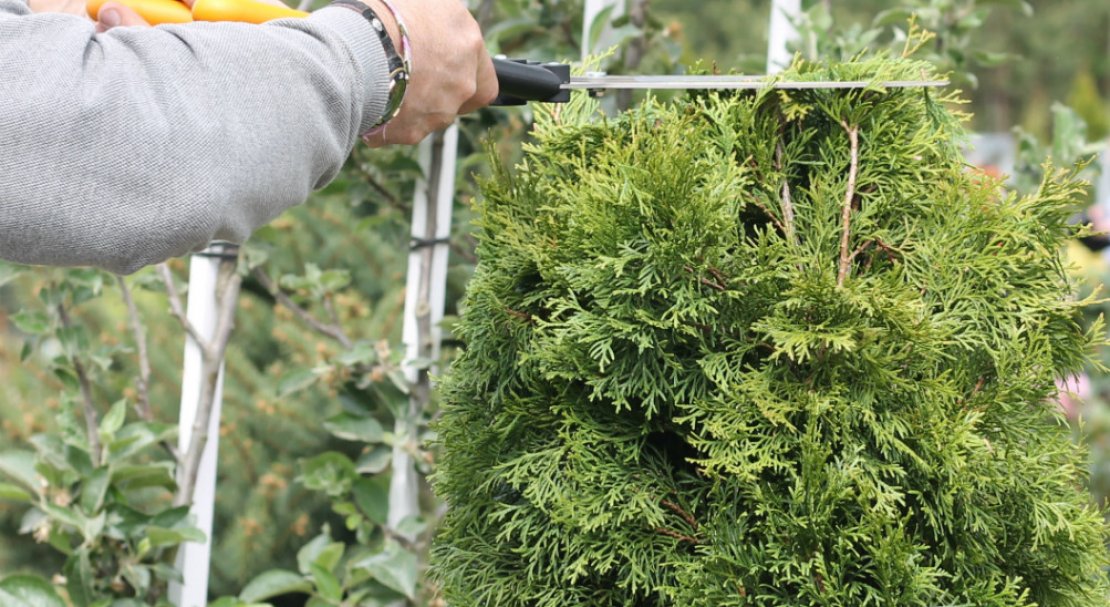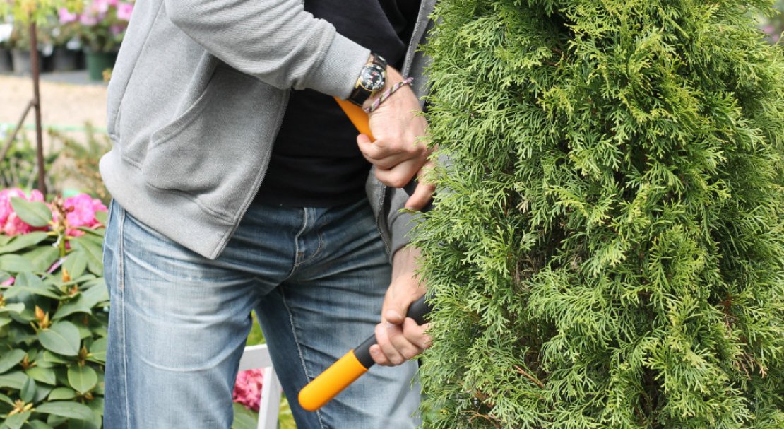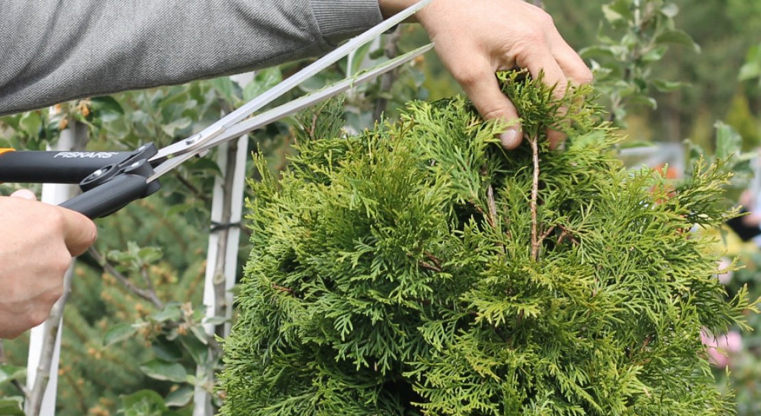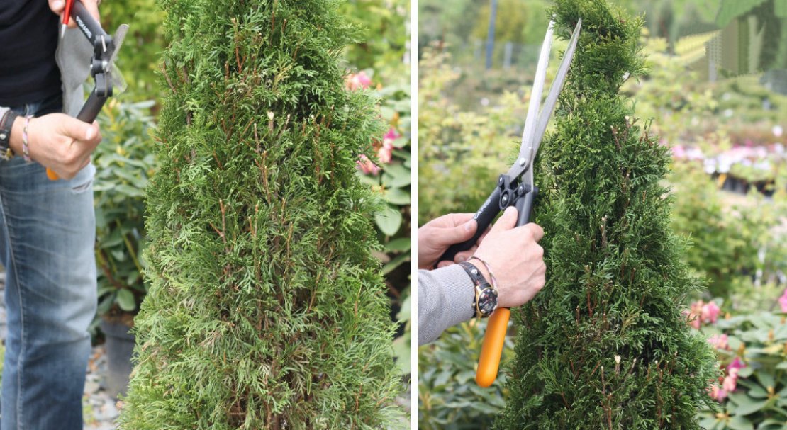 Невелика товщина і гнучкість габітусу при обрізанні не створюють перешкод для лез секатора — головне, щоб інструмент був заточений, інакше легко травмувати дерево. Довжина ручок садових ножиць дотягнеться до будь-якої висоти, серпу піддасться деревина великих гілок. Смола хвойних може викликати алергію і погано відмивається з шкіри, тому використовуйте робочі рукавички і захисний одяг. Якщо ви є власником великих туєвих насаджень або задумали кілька хитромудрих фігур з чагарників, варто серйозніше підготуватися до їх обрізанні.