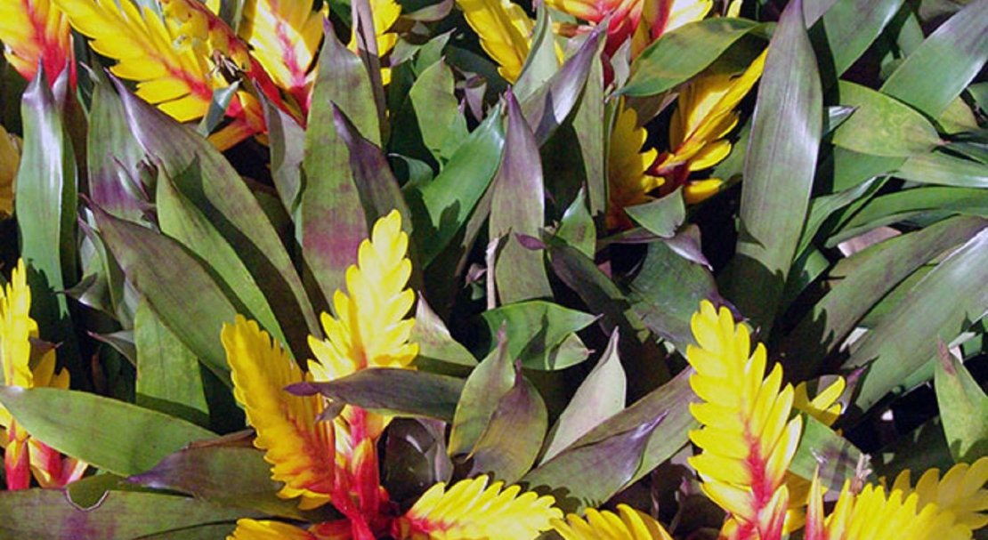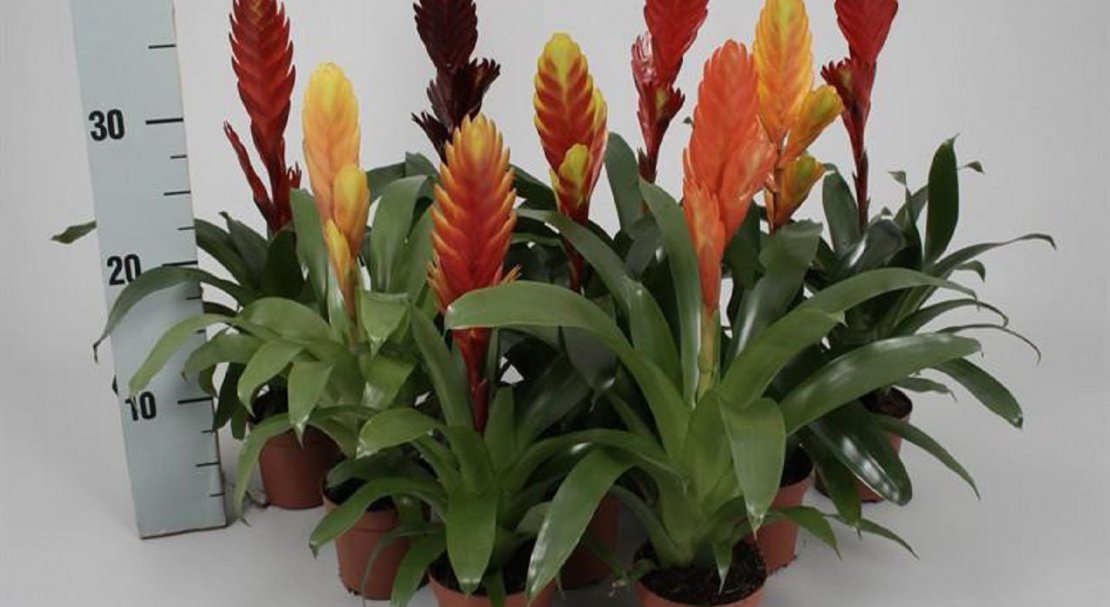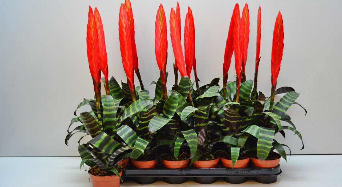- Врієзія мікс — ще один декоративний кімнатний представник, який привертає до себе увагу насиченим зеленим кольором листя і пелюсток. Самі приквітки, зазвичай жовті або червоні, вкриті лусочками. Зовнішній вигляд рослини нагадує ретельно створений флористом святковий букет, тому квітка також може послужити прекрасним подарунком. Період цвітіння врієзії мікс припадає на зиму, ближче до початку березня. Було виведено величезну кількість гібридів, що характеризуються ефектним і тривалим цвітінням.