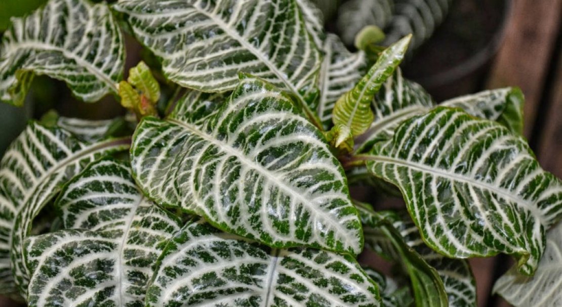 Листя куща загострені, супротивні, гладкі і блискучі, досить великі (близько 15 см в довжину і 5-10 см завширшки), збираються в характерну шишковидну розетку. Забарвлення листків строкатий, вони покриті товстою гладенькою насичено-зеленою шкіркою, поверх якої виступають численні жилки білого відтінку. По всій поверхні листка також спостерігаються різноманітні плямисті включення, надають їм особливий орнамент. Коренева система рослини мичкуватого типу, її складають численні кореневі відростки, рясно вкриті безліччю волосків.