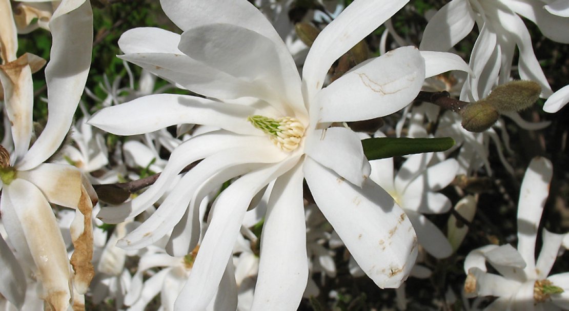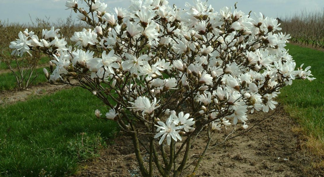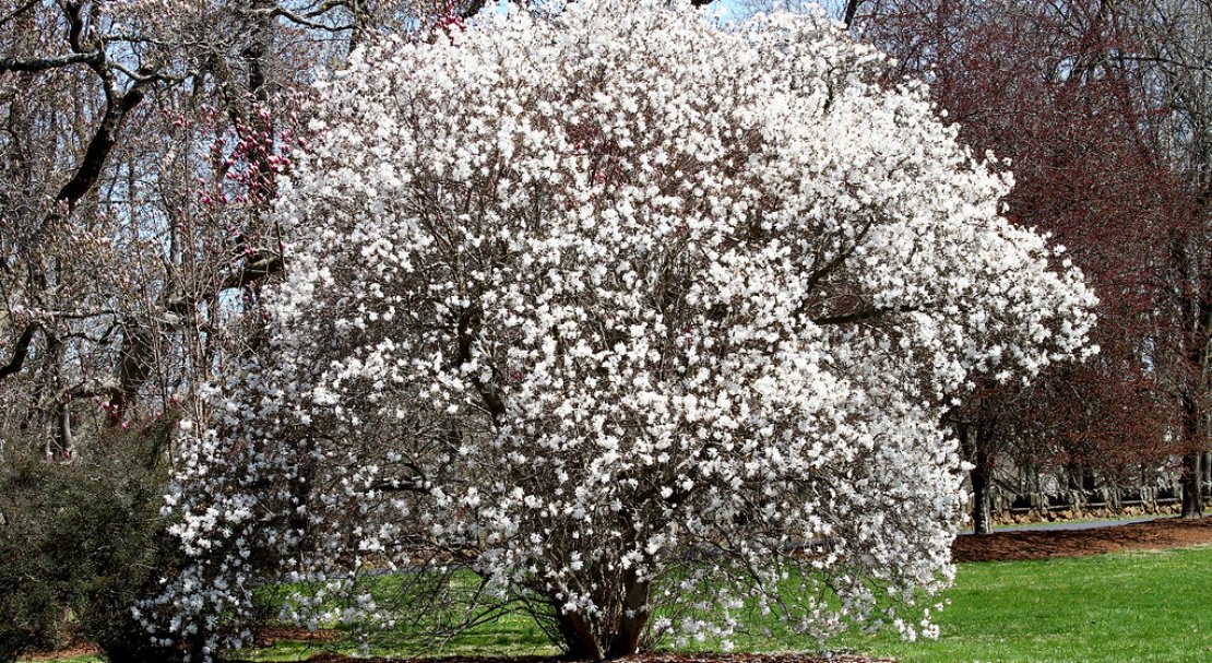 - Магнолія зірчаста. Рослина заввишки до 3 метрів, цвіте білими квітами у березні-квітні.