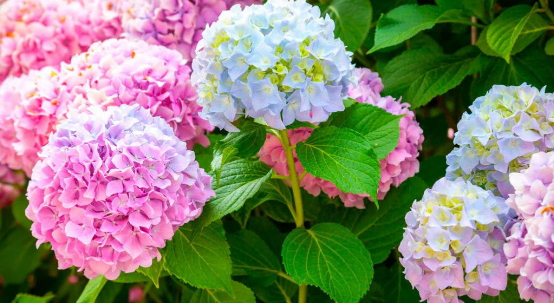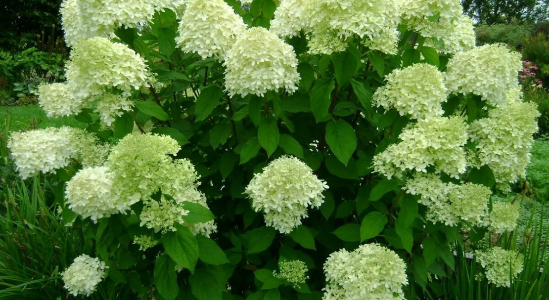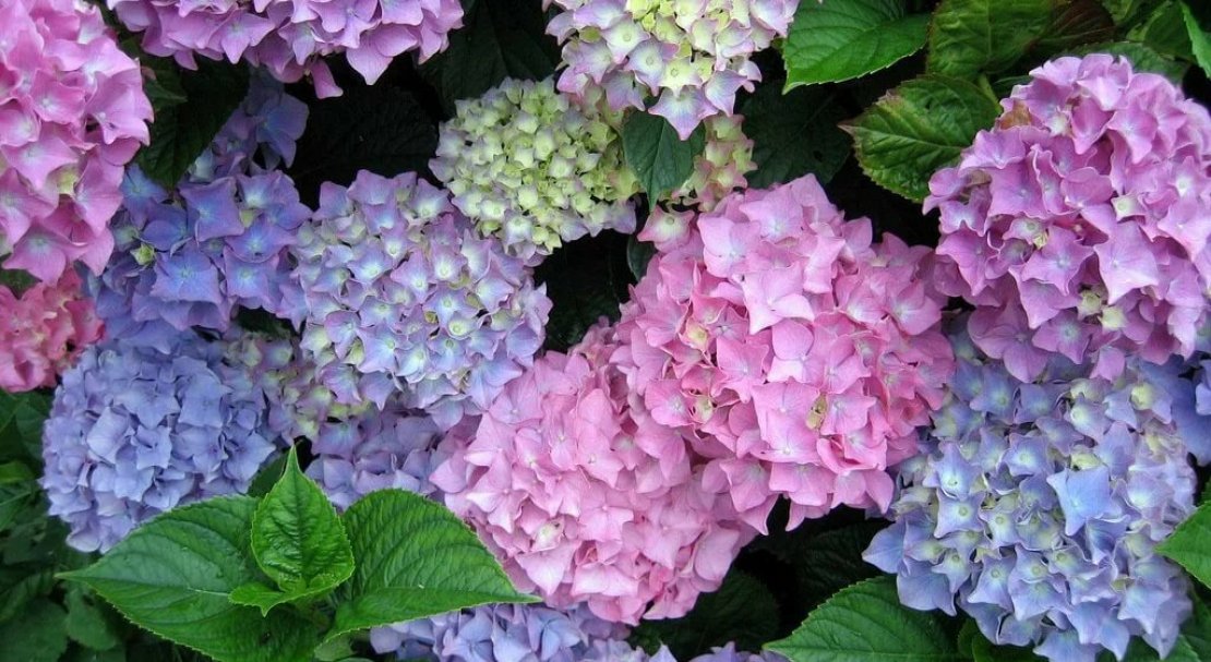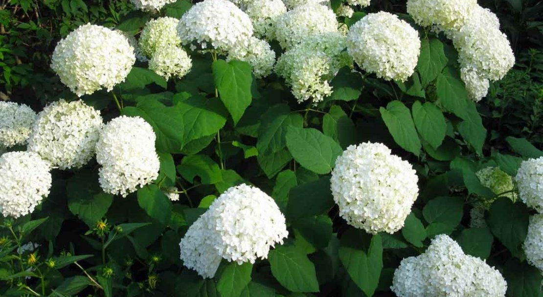 - Гортензія. Буває до 3 м у висоту. Квіти можуть бути білими, рожевими, блакитними в залежності від кислотності ґрунту. Цвіте в липні-вересні.