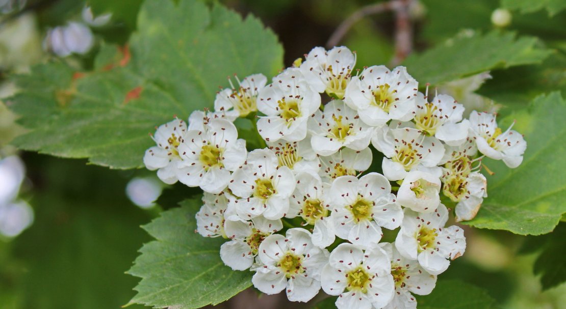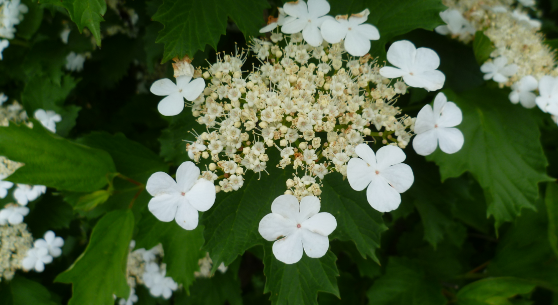 - Калина. Відмінна декоративна рослина з багатою зеленою листвою. Цвіте в травні-червні.