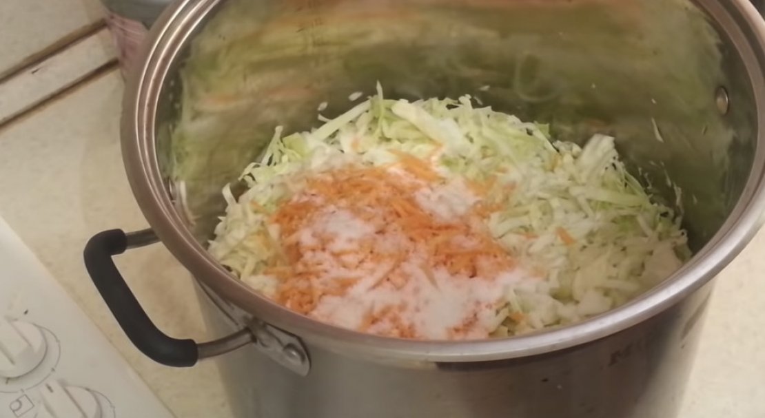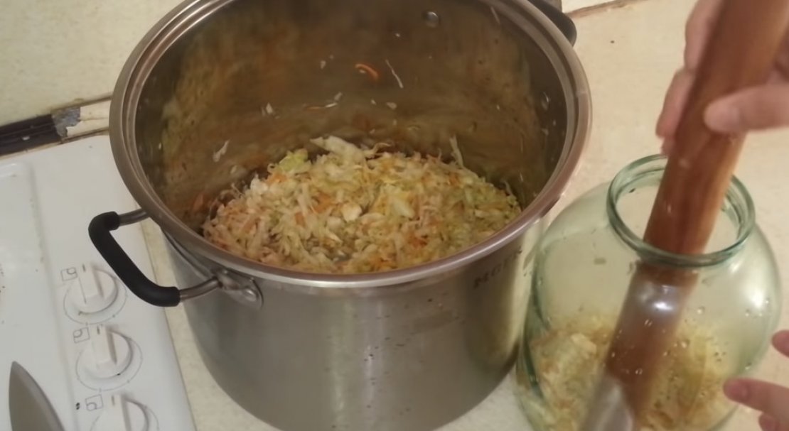 Більше всього вітамінів зберігається в качанах, засолених цілком або половинками, але для цього потрібно мати достатньо простору тару для заготівок. Зазвичай в домашніх умовах використовують трилітрові банки, а виделки дрібно шаткують гострим довгим ножем і добре перетирають з сіллю. На кожен кілограм беруть 20 г кам'яної солі. [img Потім всі складають у підготовлену тару, добре трамбують і кладуть зверху гніт і накривають марлею.Процес бродіння при кімнатних умовах зазвичай займає близько тижня. Щодня капусту обов'язково протикають тонкої палицею. У таку заготовку на початковому етапі можуть додавати моркву або гарбуз, кмин, яблука, буряк і навіть виноград.
