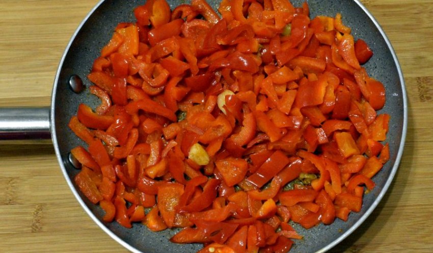 У тій же сковороді протушкувати подрібнений перець.![]()