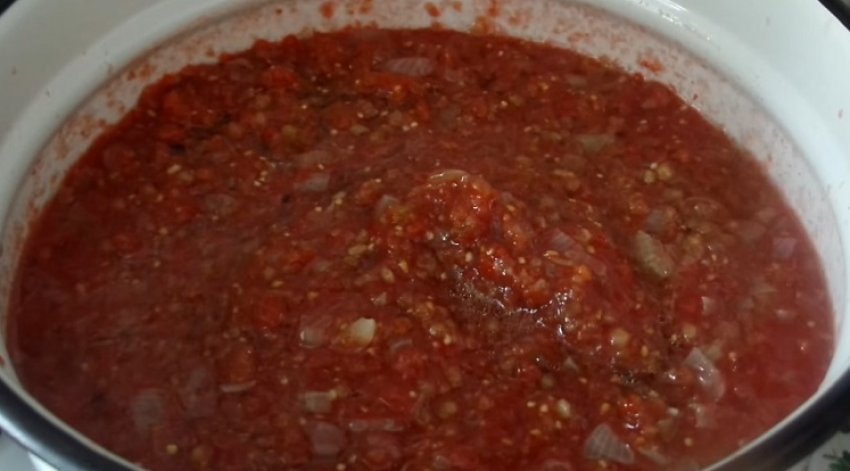 У томати налити масло, довести до кипіння. У помідорне пюре опустити баклажани, перець і цибулю. Суміш посолити. Томити пюре протягом 30-40 хвилин, постійно перемішуючи, щоб воно не пригоріло.![]()