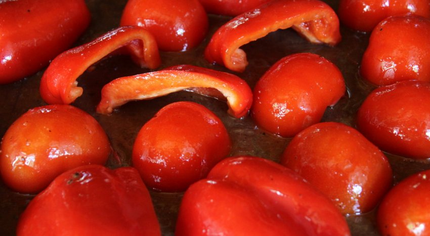 Томати і перець запекти у духовці, до готового стану.![]()