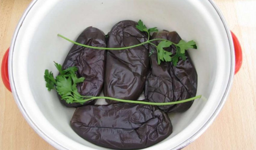 - Нафаршируйте баклажани овочевим фаршем і укласти їх в емальоване відро.