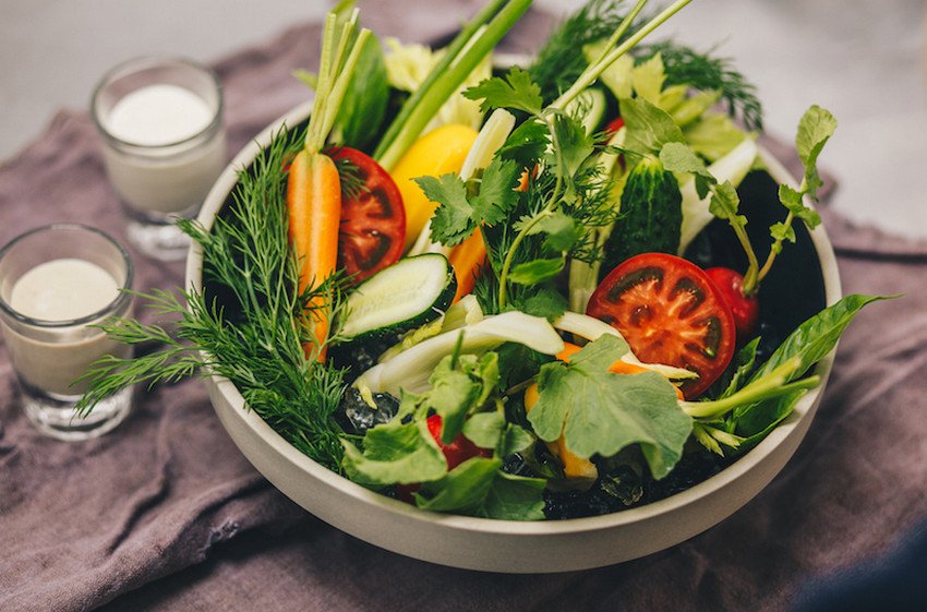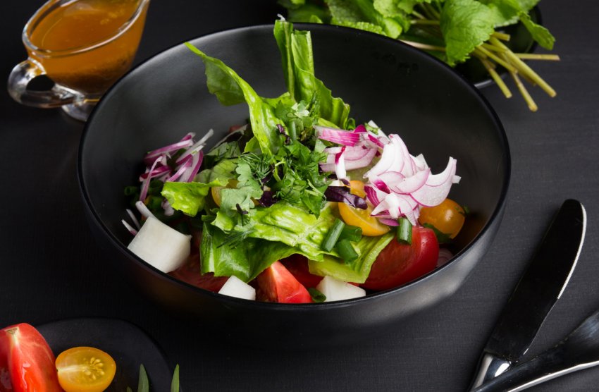 - Всі овочі нарізати, скласти в окремий посуд, посипати сіллю, перемішати. Витримати над паровою лазнею 10 хвилин.